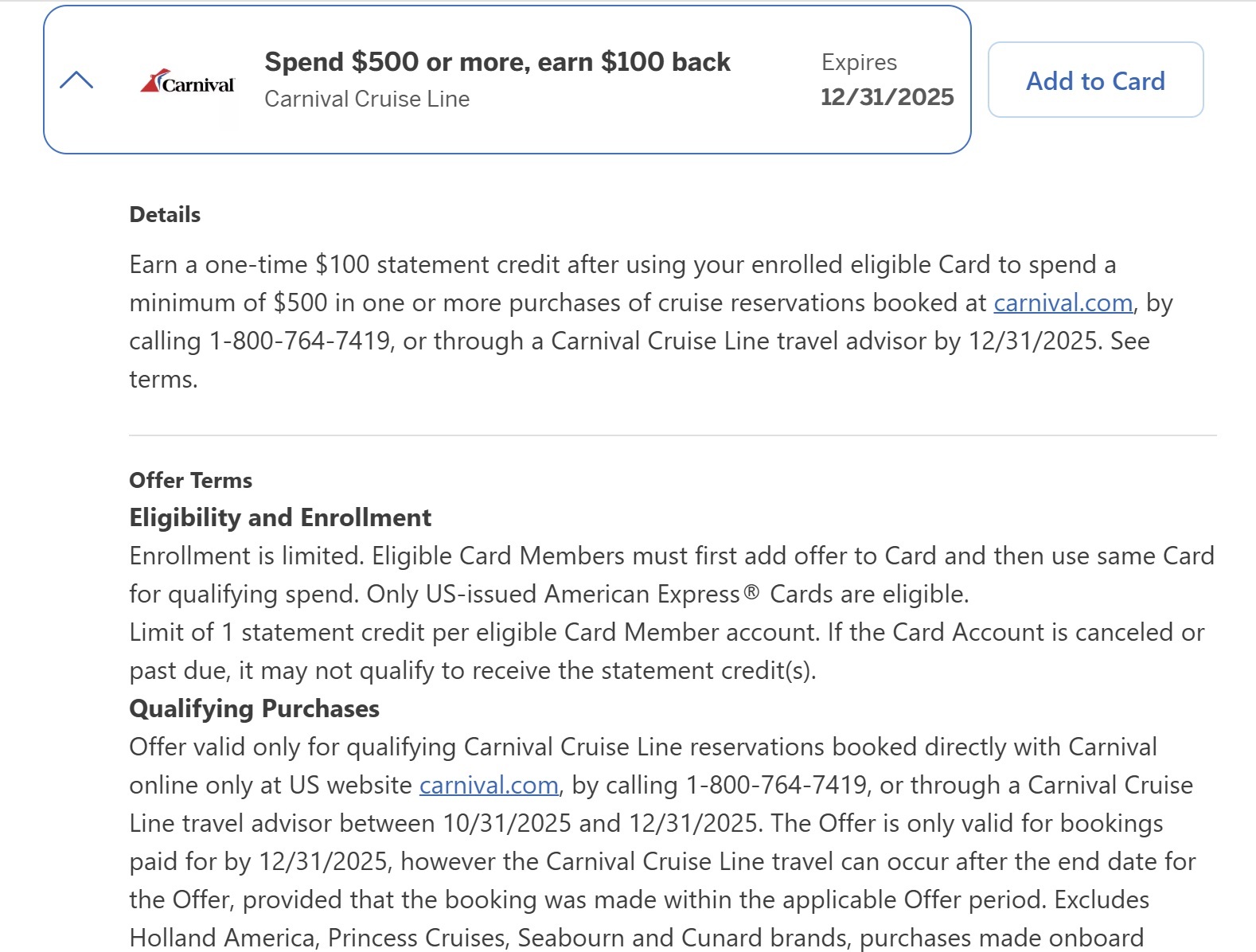 Keep in mind that these offers generally only work on expenses paid at the time of booking or when making payments toward your cruise in advance through the web portal. On-board purchases are excluded from the offer, and in my experience, Amex Offers do not work for onboard purchases. Further, this offer will only work for Carnival, not the other Carnival-owned brands (though I do see a separate Amex Offer for $250 back on $1,000 or more with Cunard for those interested).