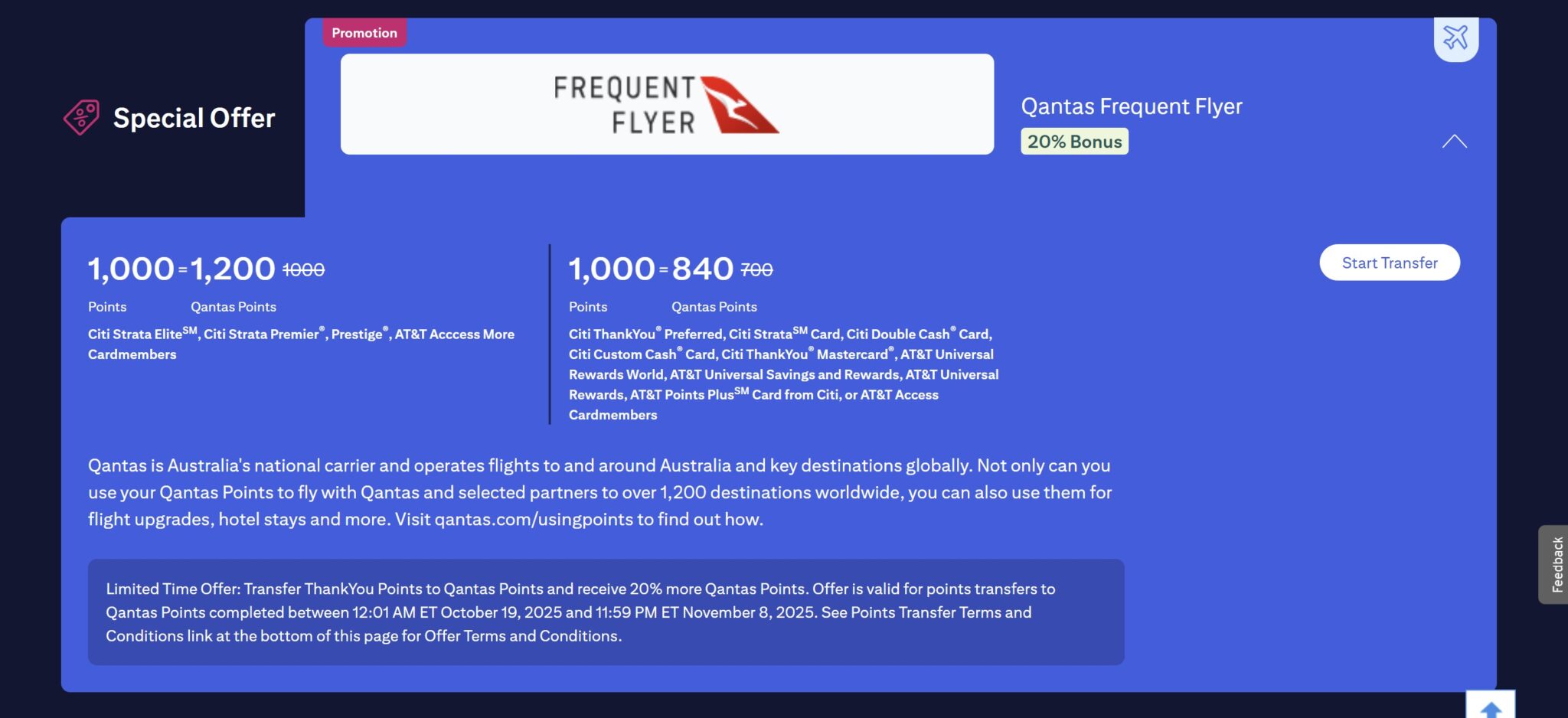- Citi ThankYou Rewards is offering a 20% transfer bonus when you transfer points to Qantas Frequent Flyer. With this bonus: