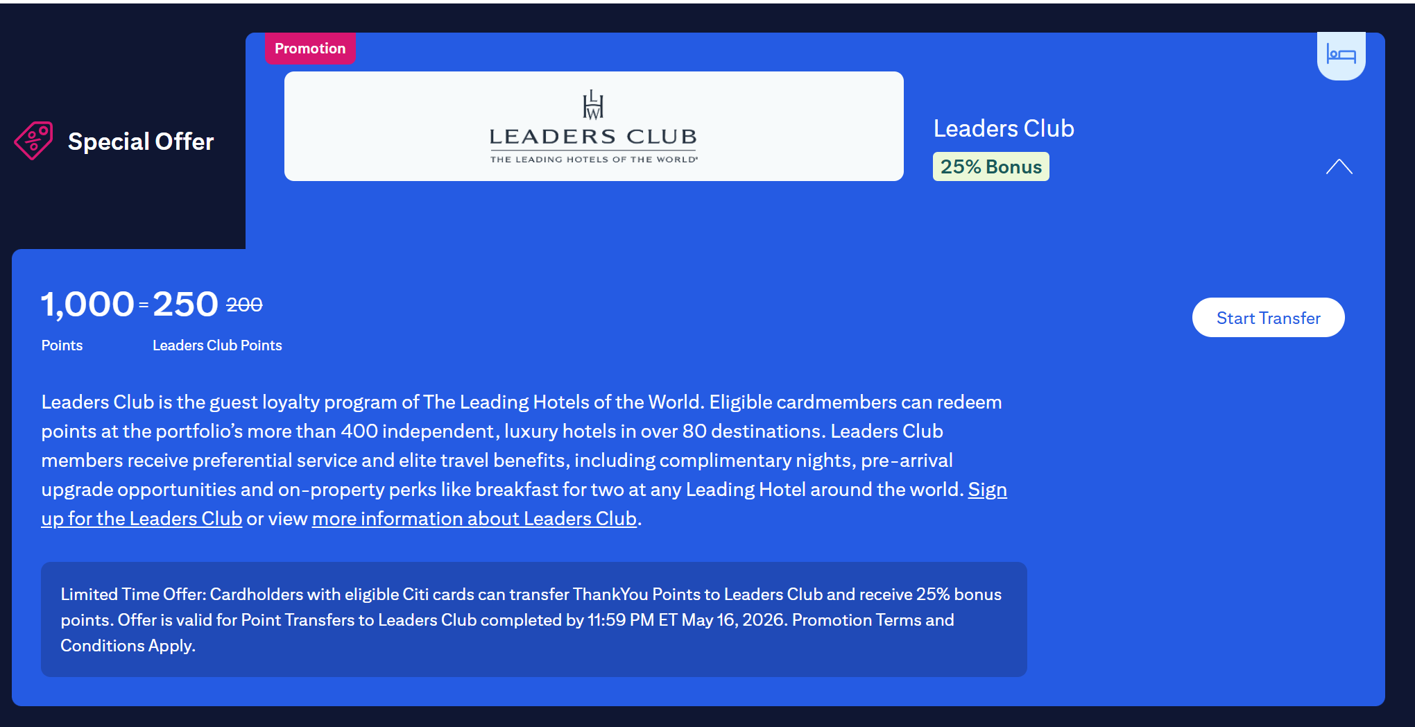 - Citi Thank You Rewards is offering a 25% transfer bonus when you transfer Thank You points to Leading Hotels of the World by 11:59pm ET on May 16, 2026. With this transfer bonus, Citi Strata Elite, Strata Premier, and AT&T Access More customers can access the following transfer ratio: