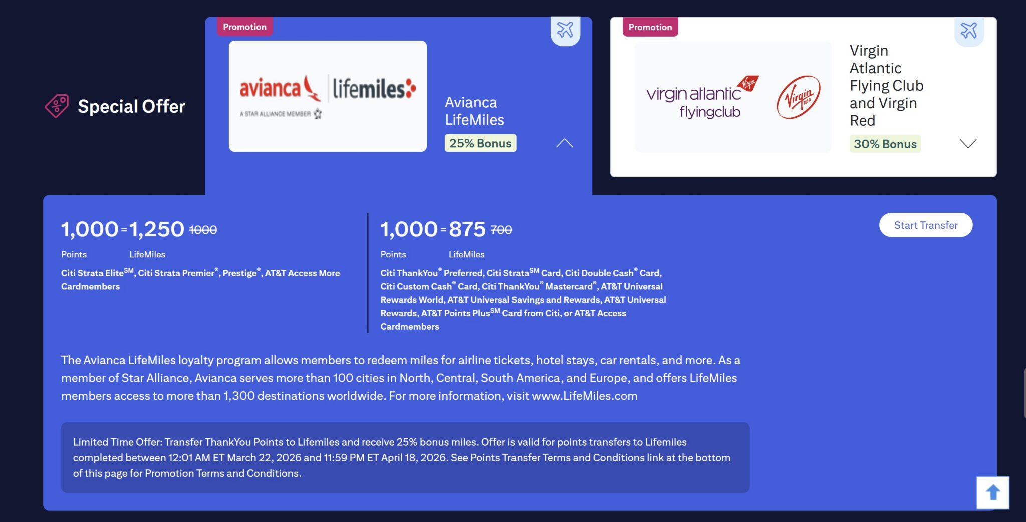 - Citi ThankYou Rewards is offering a 25% transfer bonus when you transfer ThankYou Rewards to Avianca Lifemiles. With this bonus (and a Citi Strata Elite, Strata Premier, Prestige, or AT&T Access More card), the transfer ratio becomes: