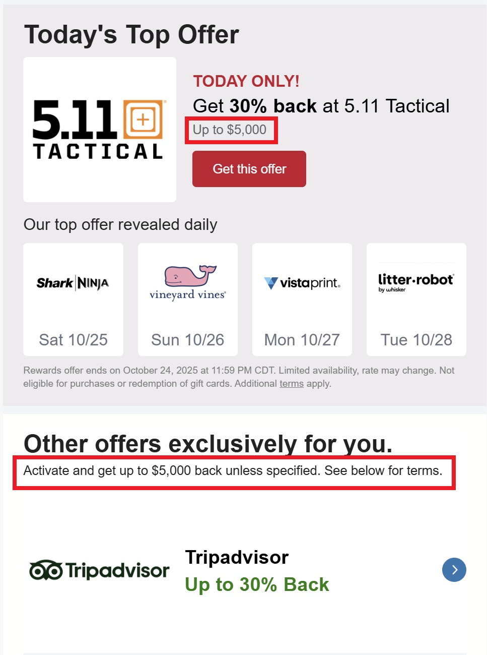 I’ve noticed the $5000 cap seems to apply to “Today’s Top Offer” and only in the emails. I also took advantage of yesterdays SharkNinja offer of 60% with a $5000 cap. My cash back was $227 so I can’t say whether the $5000 cap worked or not.
