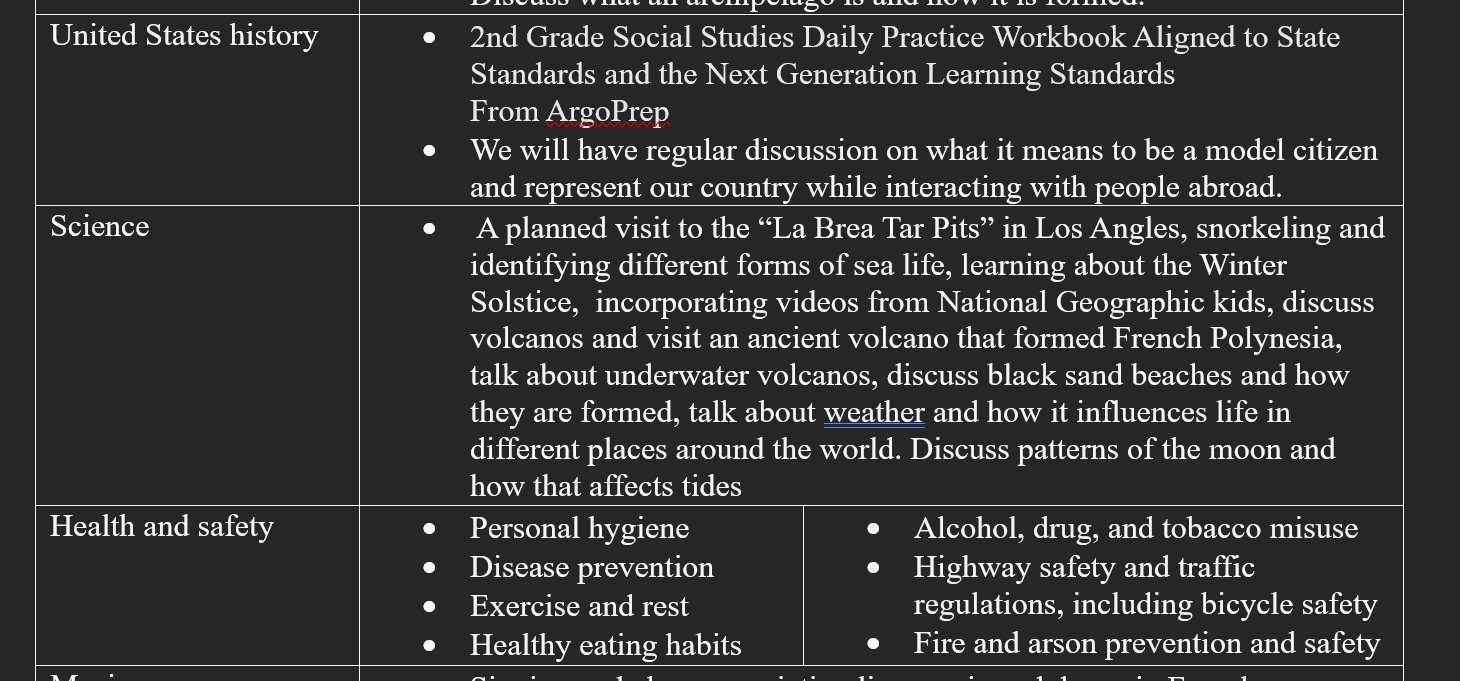 All kids from Kindergarten through 12th grade also need to learn about patriotism and citizenship; health education regarding alcohol, drug, and tobacco misuse; highway safety and traffic regulations, including bicycle safety; and fire and arson prevention and safety. We addressed these within the bullet points of other subjects. For instance, under our “United States History”, we mentioned having regular discussions on what it means to be a model citizen and represent our country while interacting abroad.