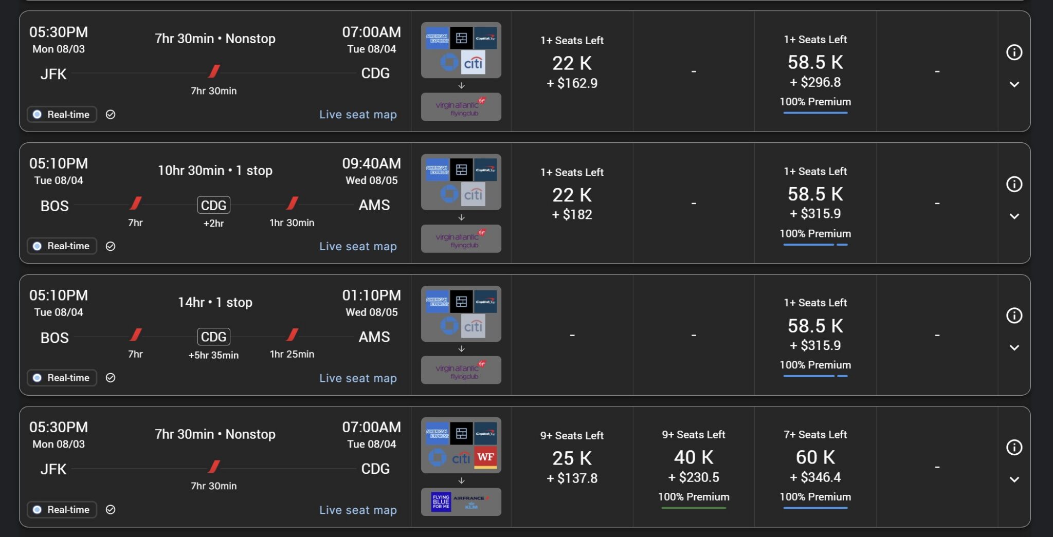 As you can see above, the first 3 itineraries are tickets for travel on Air France but are issued by Virgin Atlantic Flying Club. Notice that taxes & fees on those Virgin Atlantic-issued award tickets are $296.80 – $315.90. You’ll save a bit by booking through Virgin Atlantic (even before considering a transfer bonus).