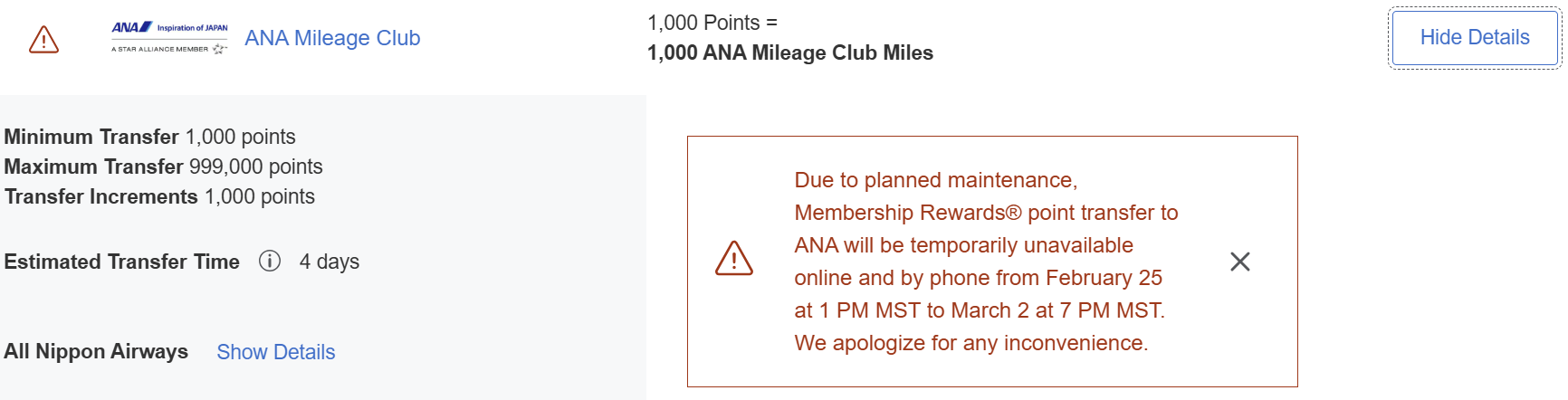 The message on Amex’ website says that the outage will last until March 2nd and is due to “planned maintenance.” Undoubtedly that’s true, but the question is, is the planned maintenance due to an incoming Amex-to-ANA devaluation?