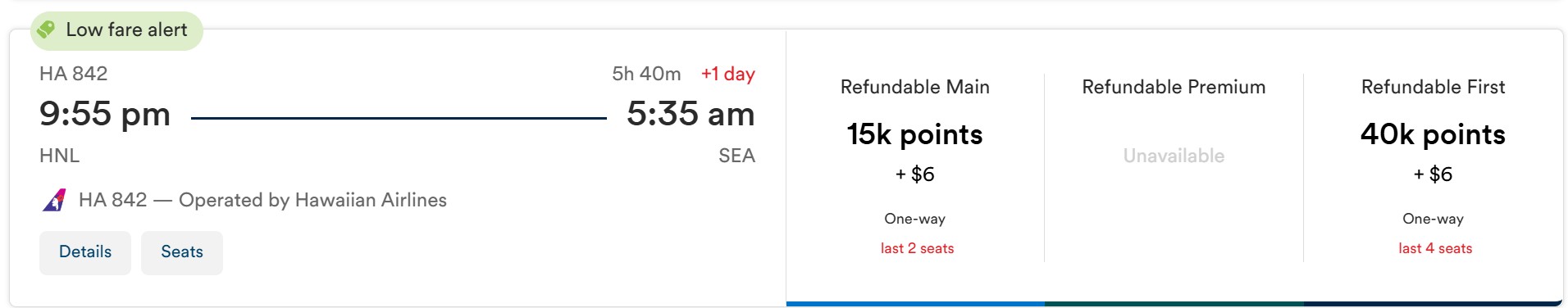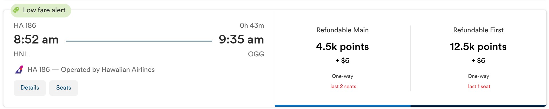 One great thing about this change is that flights within Hawaii now start at only 4,500 points one-way. Previously, the same flights cost 15,000 points one way. Also, even though the chart shows that the cheapest first-class flights start at 15,000 points, they’re actually priced as low as 12,500 points:
