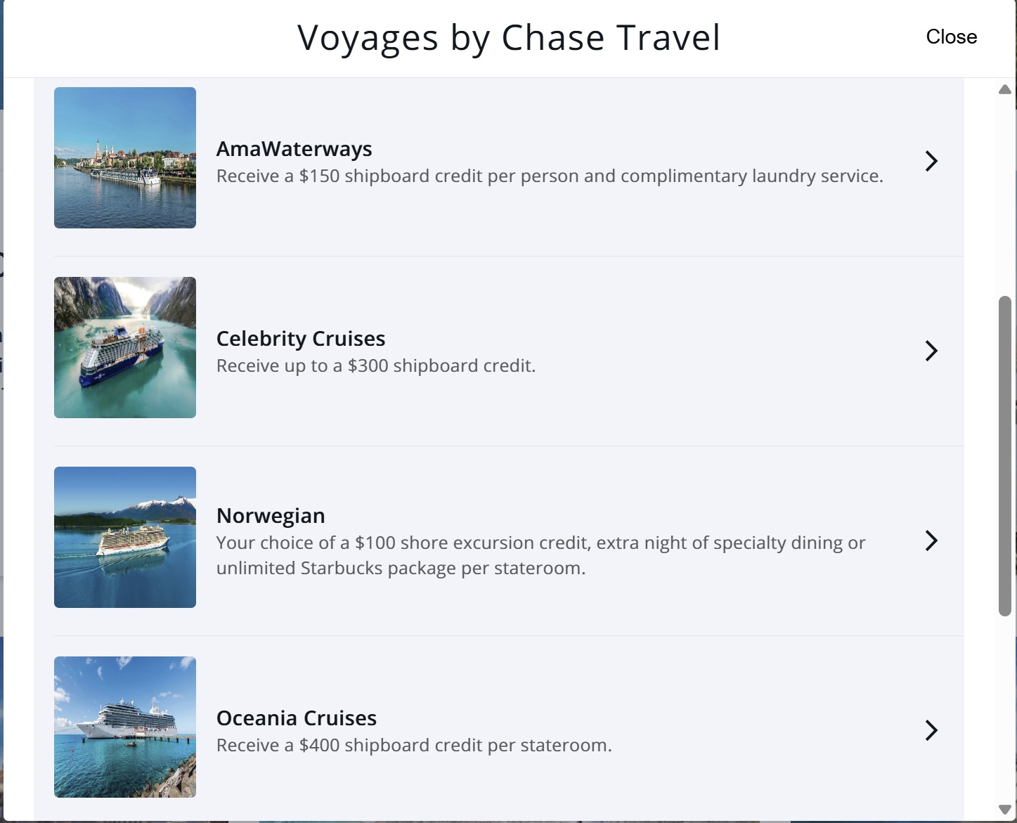 The Chase Sapphire Preferred and Chase Sapphire Reserve have a similar benefit called Voyages by Chase Travel, which similarly offers onboard credit and unique amenities when booking a cruise through Chase Travel.