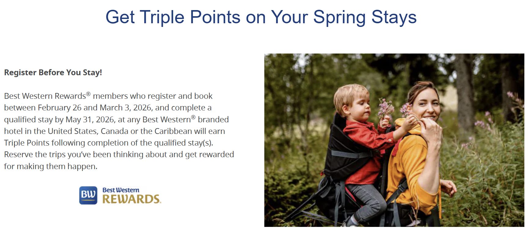 - Best Western Rewards members (“Rewards Member(s)”) who (a) register for the promotion and book travel between February 26, 2026 and March 3, 2026; and, (b) complete a qualified stay* between February 26, 2026 and May 31, 2026 (“Promotion Period”) at any Best Western® branded hotel in the United States, Canada, or the Caribbean Islands, and (c) have a valid email address listed in the Rewards Member’s account profile at the time of registration for the promotion will earn triple BWR Points** for completion of the qualified stay.