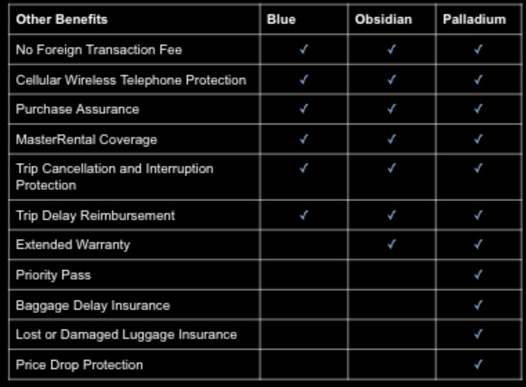 It is worth mentioning that all three cards will carry some Mastercard-related benefits as the Blue and Obsidian cards will be World Elite Mastercards and the Palladium card will be a World Legend Mastercard. This chart shows benefits at a high level, though we don’t yet have full details regarding coverage limits: