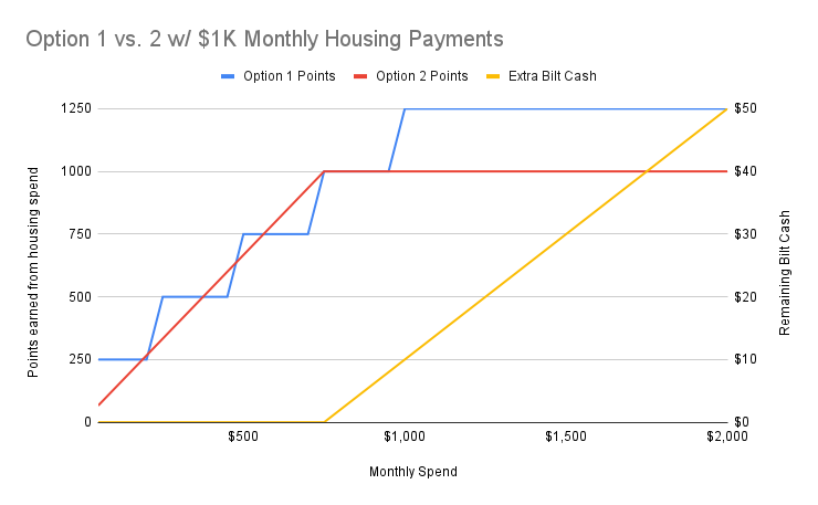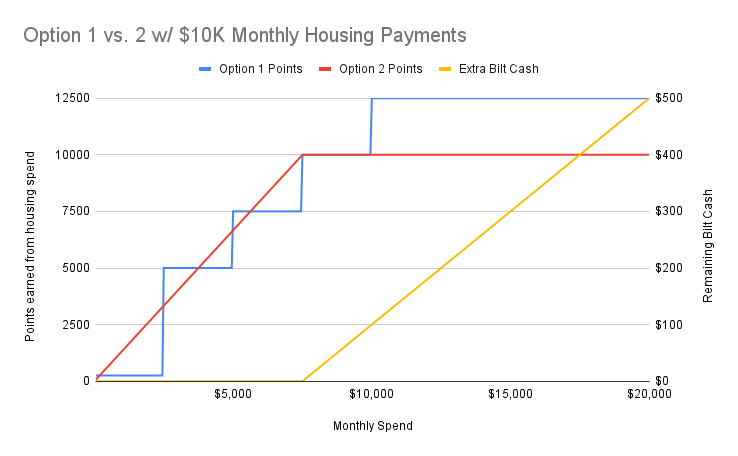 - When monthly spend exceeds housing payments, Option 1 is consistently 25% better than Option 2, but only if you don’t value left-over Bilt Cash.