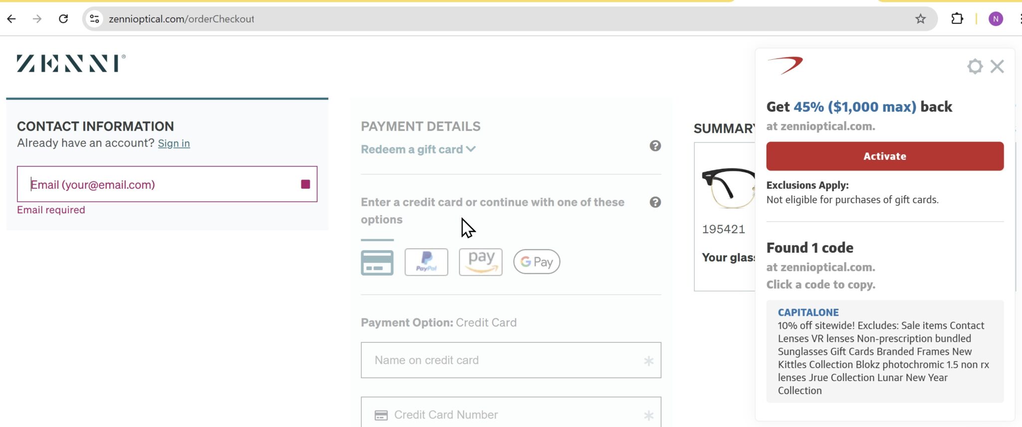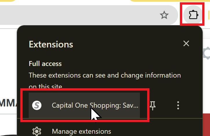 1. Click through from your chosen email offer in the browser where you have the Capital One Shopping browser extension installed (note that you don’t necessarily need the extension installed, but this makes it easier to verify that the offer has been activated). I do this in a browser instance that has no other extensions installed to minimze the chance of any interference.