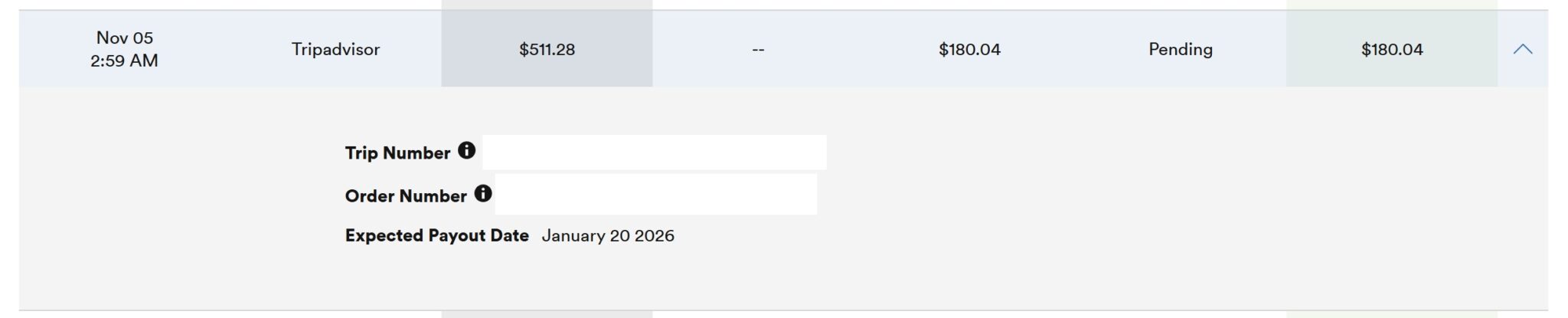 • Pending: Your purchase tracked successfully. The line item will show how much you spent on your purchase and how much you are due in rewards.