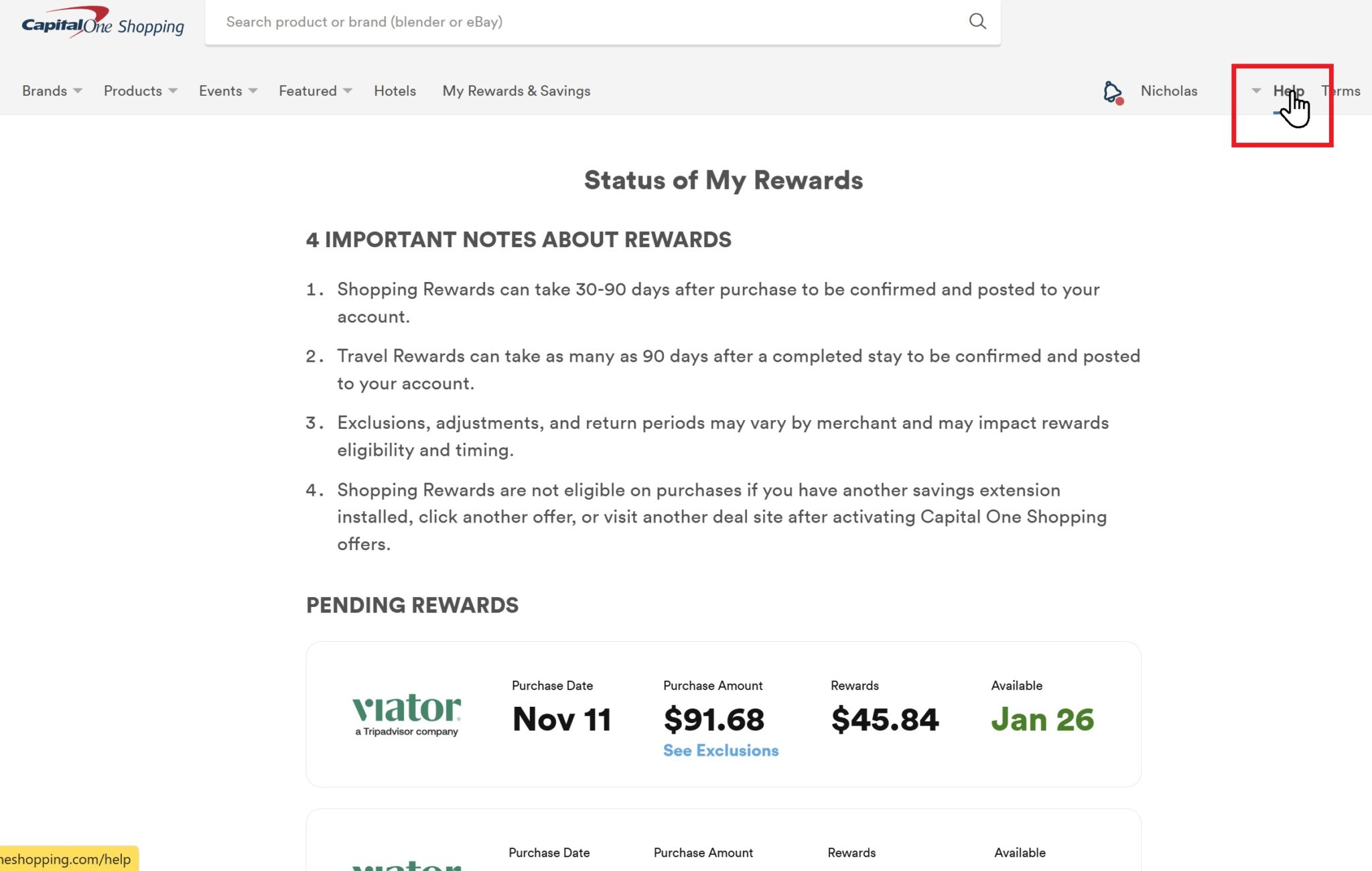 Alternatively, you can click “Help” to go to the Capital One Shopping Help page. The resulting page shows a list of your recent successfully-tracked purchases with the dates when the rewards from those purchases will become “credited” and available for redemption.