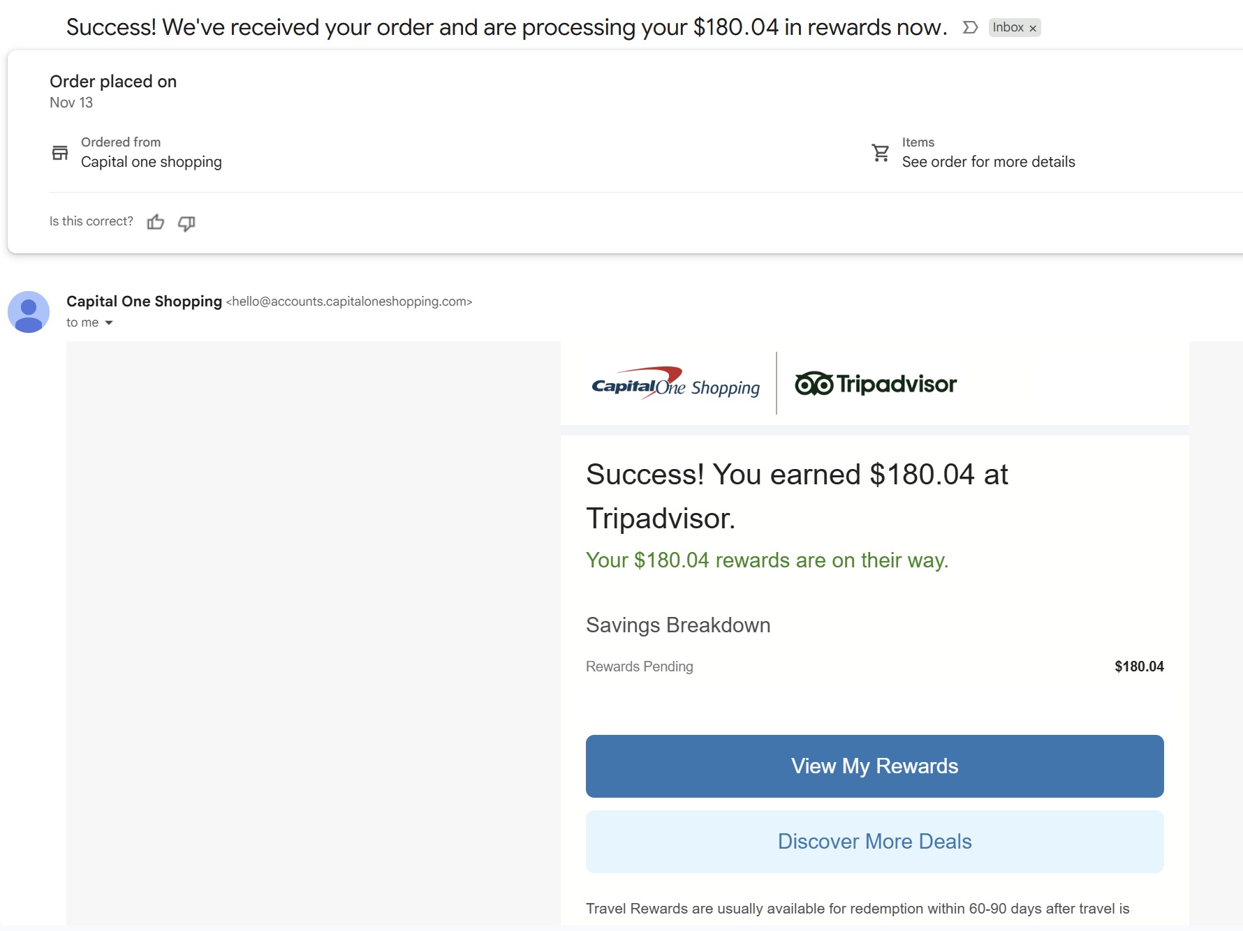 Capital One Shopping does not track as quickly as some portals. Whereas purchases through portals like Rakuten or Rove Miles tend to sometimes track within hours (triggering an email to confirm tracking), Capital One Shopping offers typically take days to show tracking. They sometimes send an email to confirm that an order has tracked (with the subject line, “Success! We have your order for….”), but this is incredibly inconsistent.