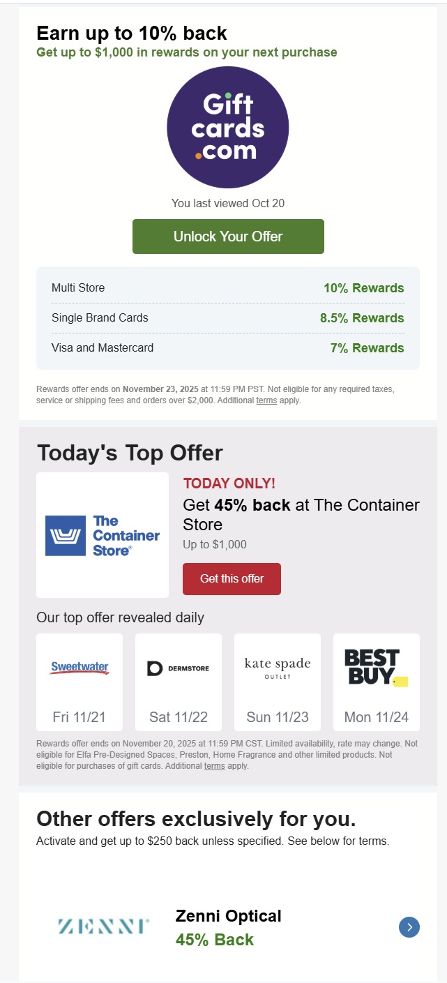 Sometimes, Capital One Shopping email offers will have a headline from a specific store you have visited, but you still want to click into the email and scroll through the entire thing. For instance, I recently received this email headlining an offer of up to 10% back at GiftCards.com, but as you can see, the same email contained completely unrelated offers for 45% back at The Container Store and Zenni Optical.