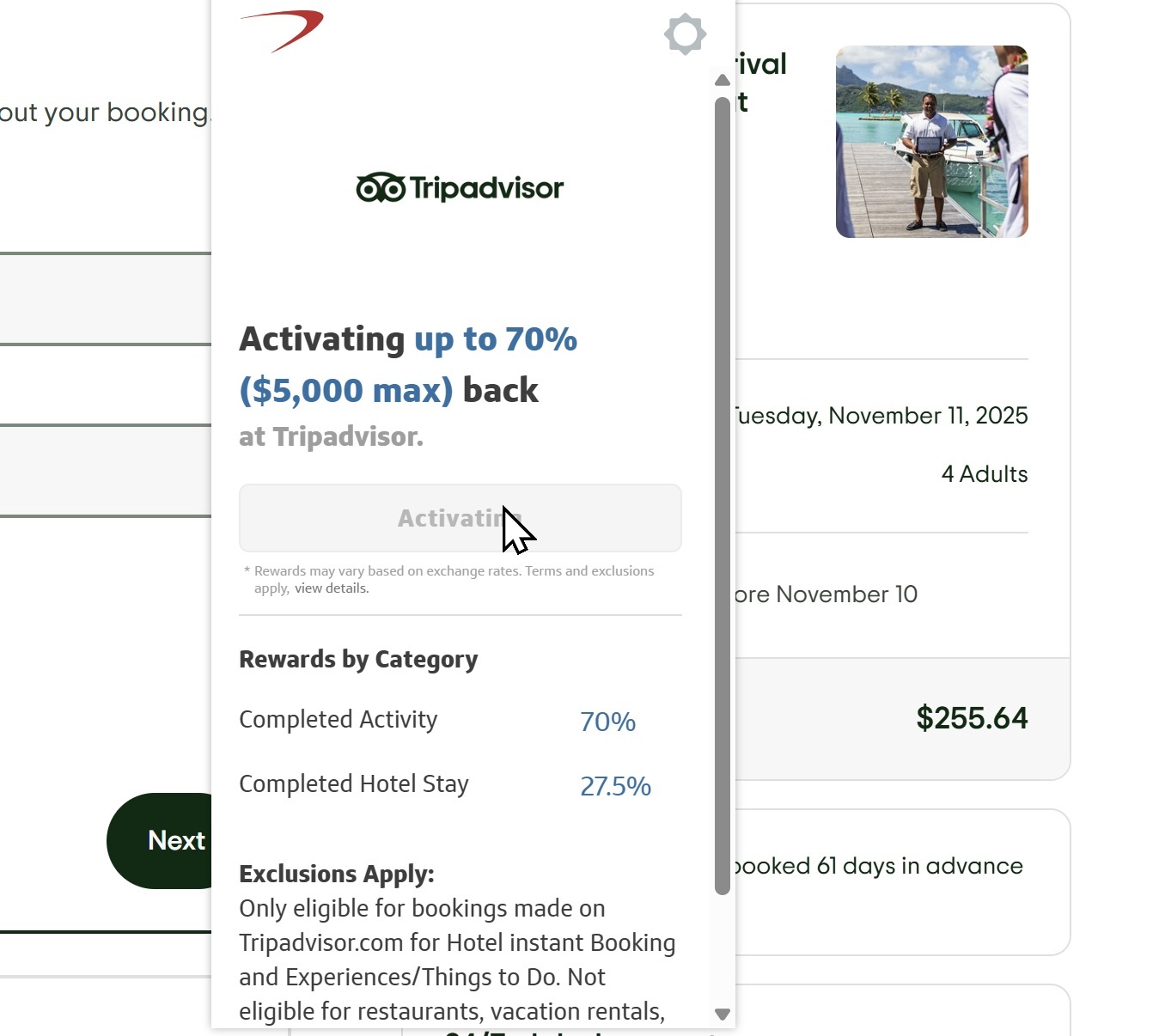 The same thing happened last week with TripAdvisor: I booked a private airport transfer from Bora Bora airport to the St. Regis Bora Bora, which came to $255.64 for my family of four. I first clicked through from the email button with the 70% back offer in the browser where I have the Capital One Shopping extension installed. After clicking through from the email in that browser, I was able to verify the 70% back showed up via the extension in that browser window after clicking through the email.