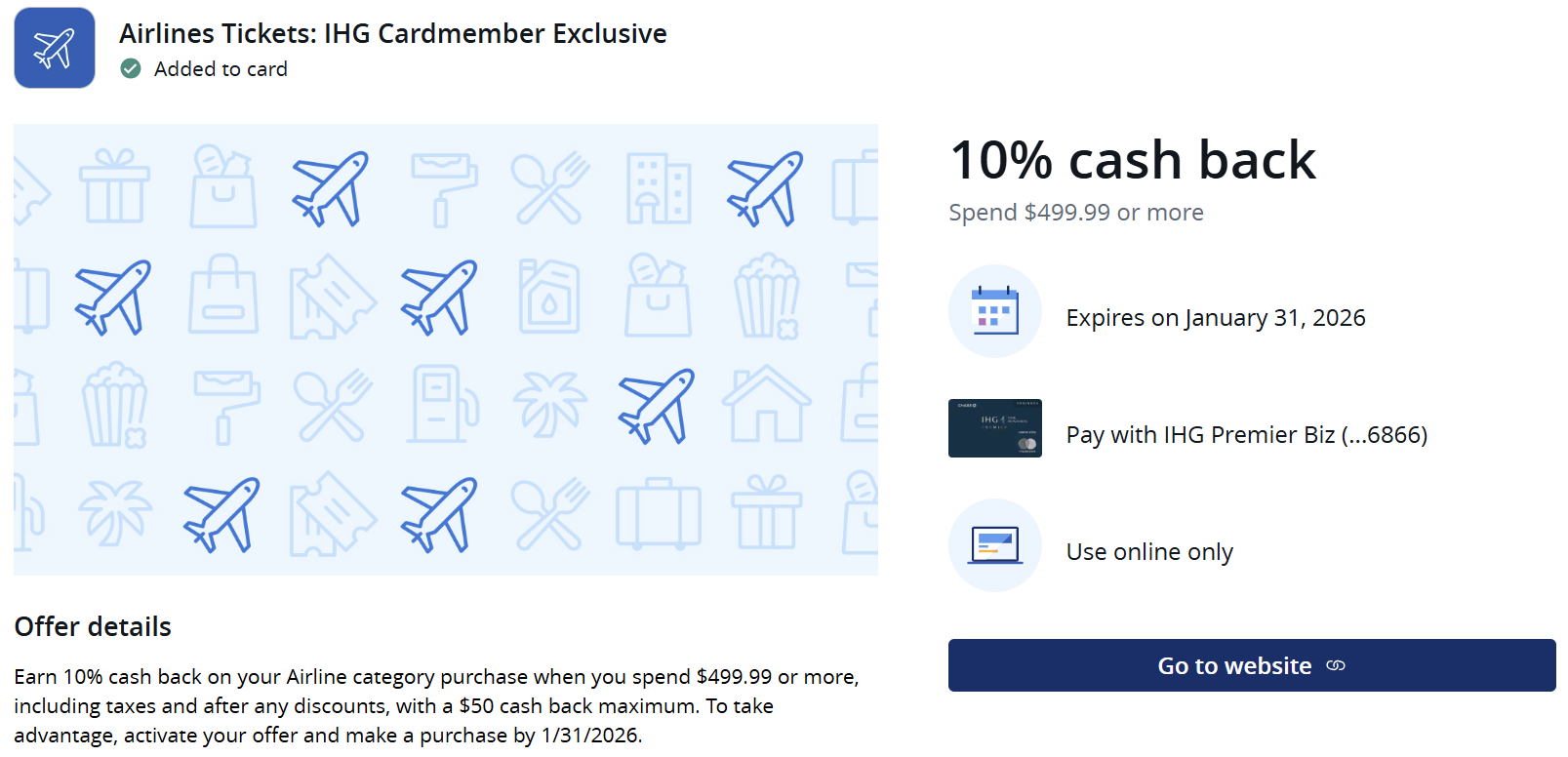 - IHG cardholders can receive $50 cash back on an online airfare purchase of $499.99 or more made directly with an airline.
