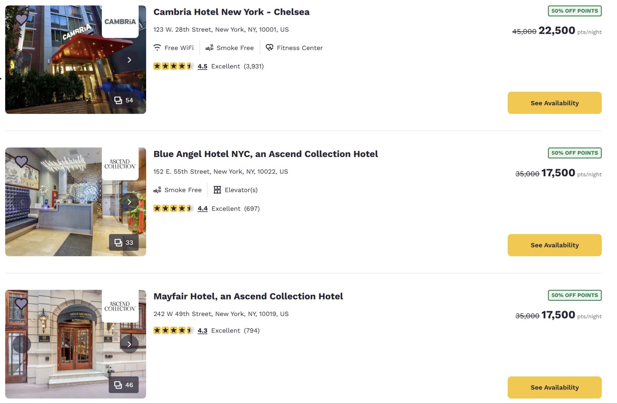 That’s just a small sampling. Most of the properties I’ve seen included are Ascend Collection properties (especially common in foreign countries), with a handful of Radisson Blu, Westgate, Bluegreen Vacations, and Cambria locations around the United States. I found a few Radisson Individuals properties in Latin America, though cash prices appeared to be relatively low on the ones I checked.