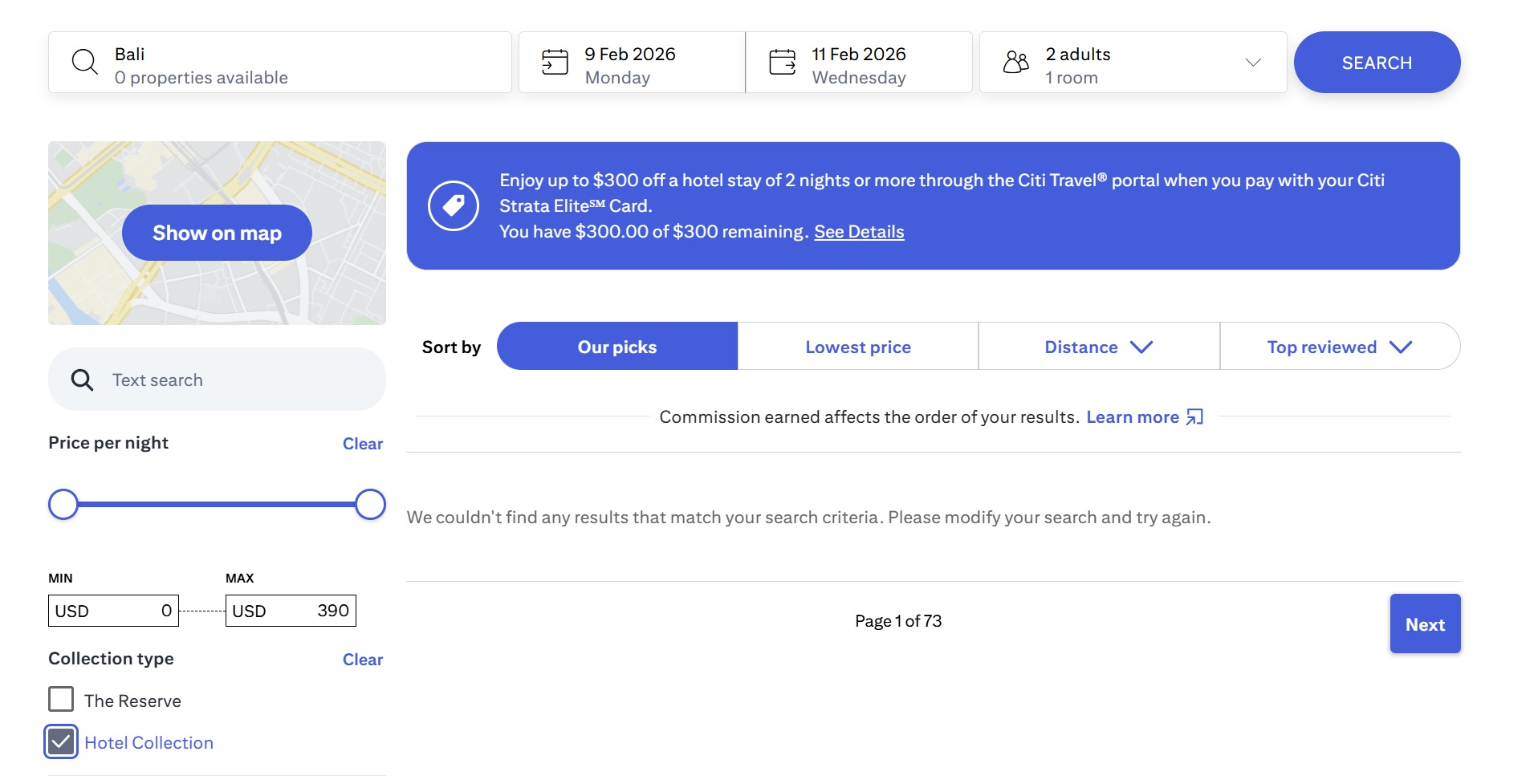 The main reason I think this could be an IT issue rather than an effort to block certain destinations is because in Bali, when I select “Hotel Collection”, which is one of Citi’s luxury booking platforms (similar to Amex’s The Hotel Collection or Capital One’s Lifestyle Collection), Bali returns a price range of $0-$390 USD despite showing no available properties.