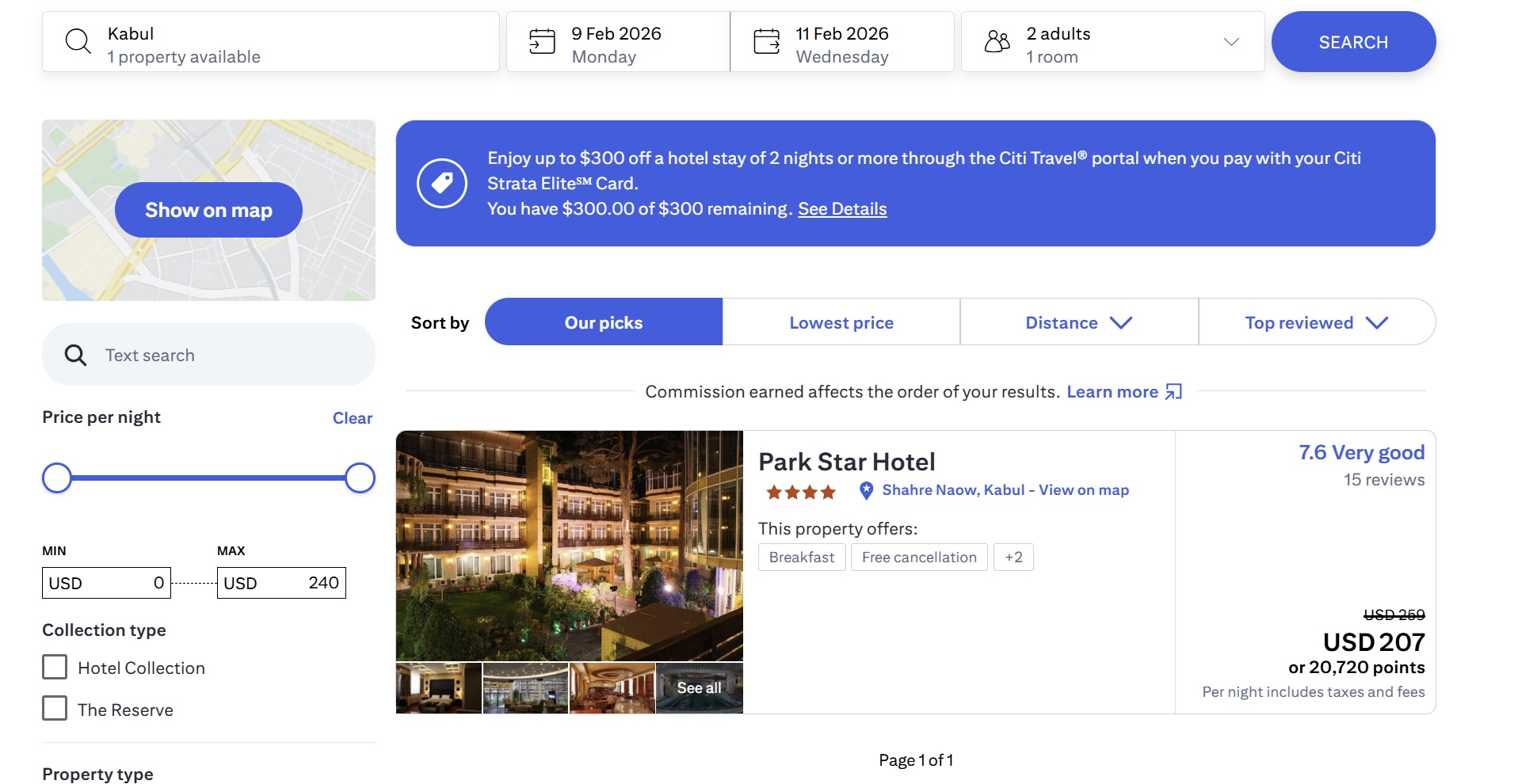 I also searched for a number of cities in places where the US doesn’t have particularly warm relations that were still available to book. For instance, the US does not have diplomatic relations with Afghanistan, but I found a hotel bookable via Citi in Kabul.