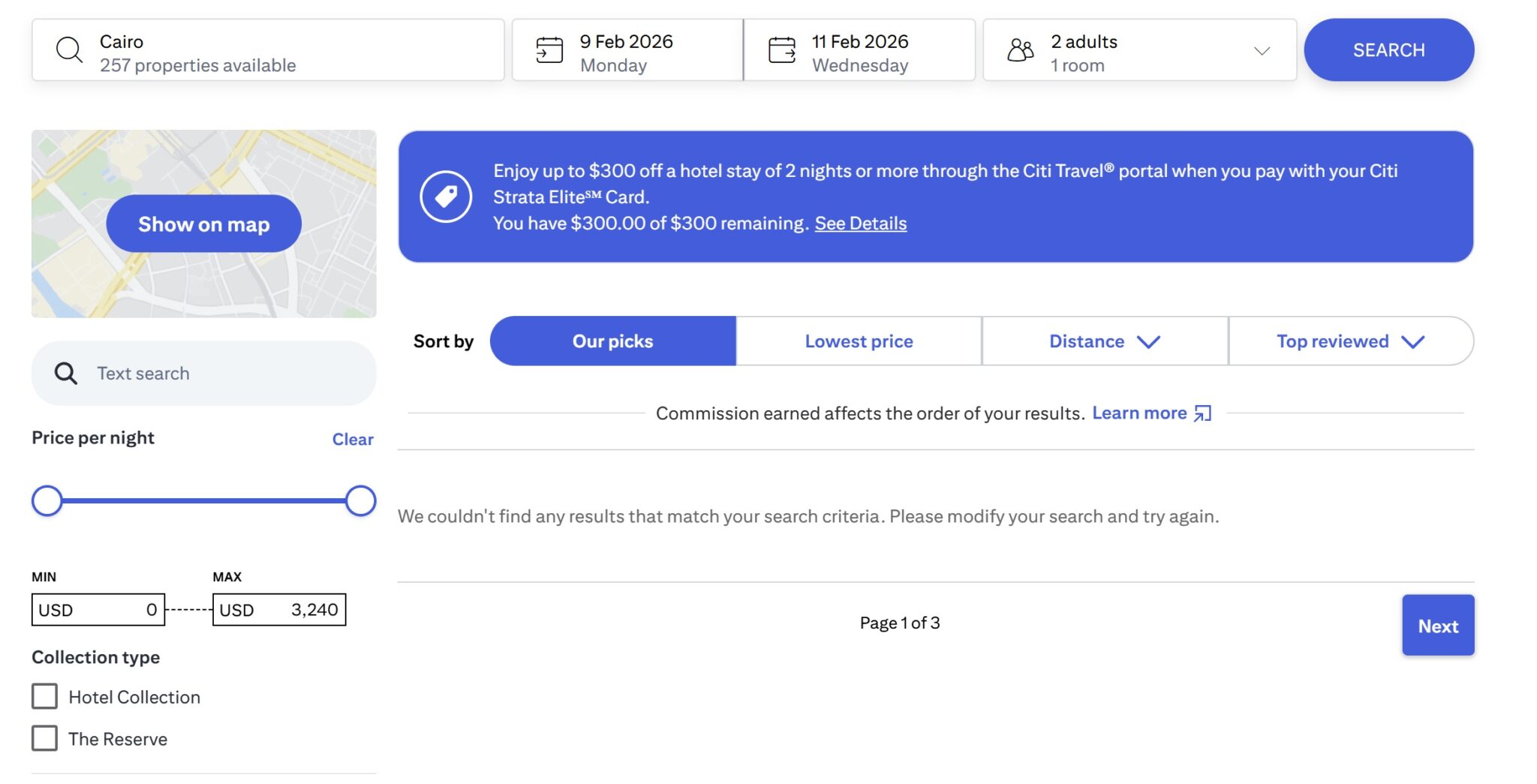 At first, you might think that Citi simply isn’t getting correct data in its booking platform, and that is making it appear as though there are no hotels available.