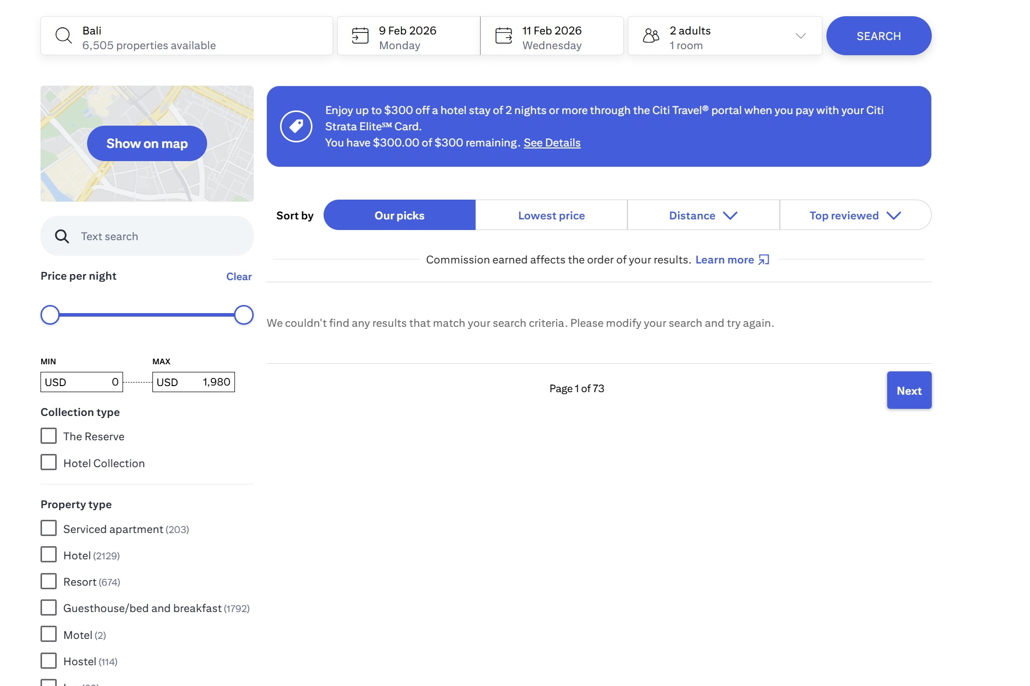 Indonesia has the same situation. Surprisingly, though Citi reports more than six thousand properties available under “Bali”, and 73 pages of hotel results, they seem to block booking any of them.