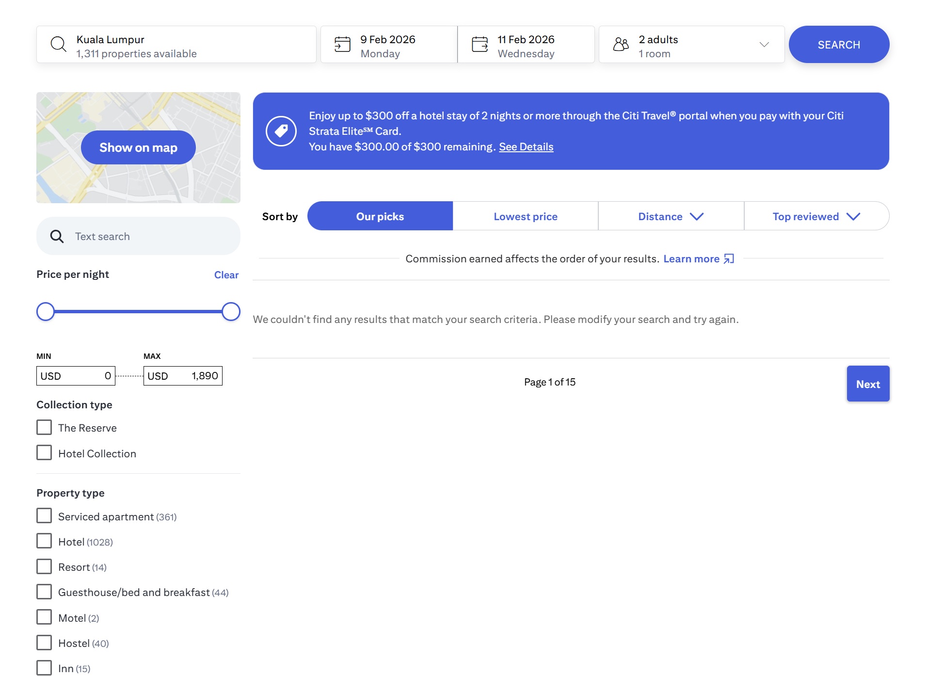 You can also notice above that there is a breakdown of property type — it shows 275 Hotel, 46 Guesthouse/bed and breakfast, 3 Motel, 61 Hostel, etc. If you select one of the categories, like “Hostel”, the price range automatically adjusts to $0-$70, suggesting that Citi is aware of the pricing of hotels in that category.