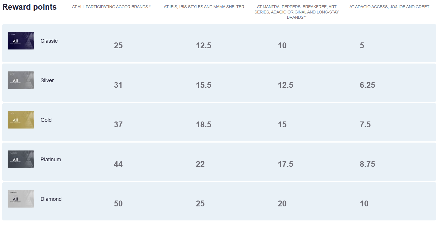 Accor has a deceptively complex system for awarding points for hotel stays that varies by brand and elite status. Most Accor brands earn 25 status points per €10 spent spent, before elite bonuses.