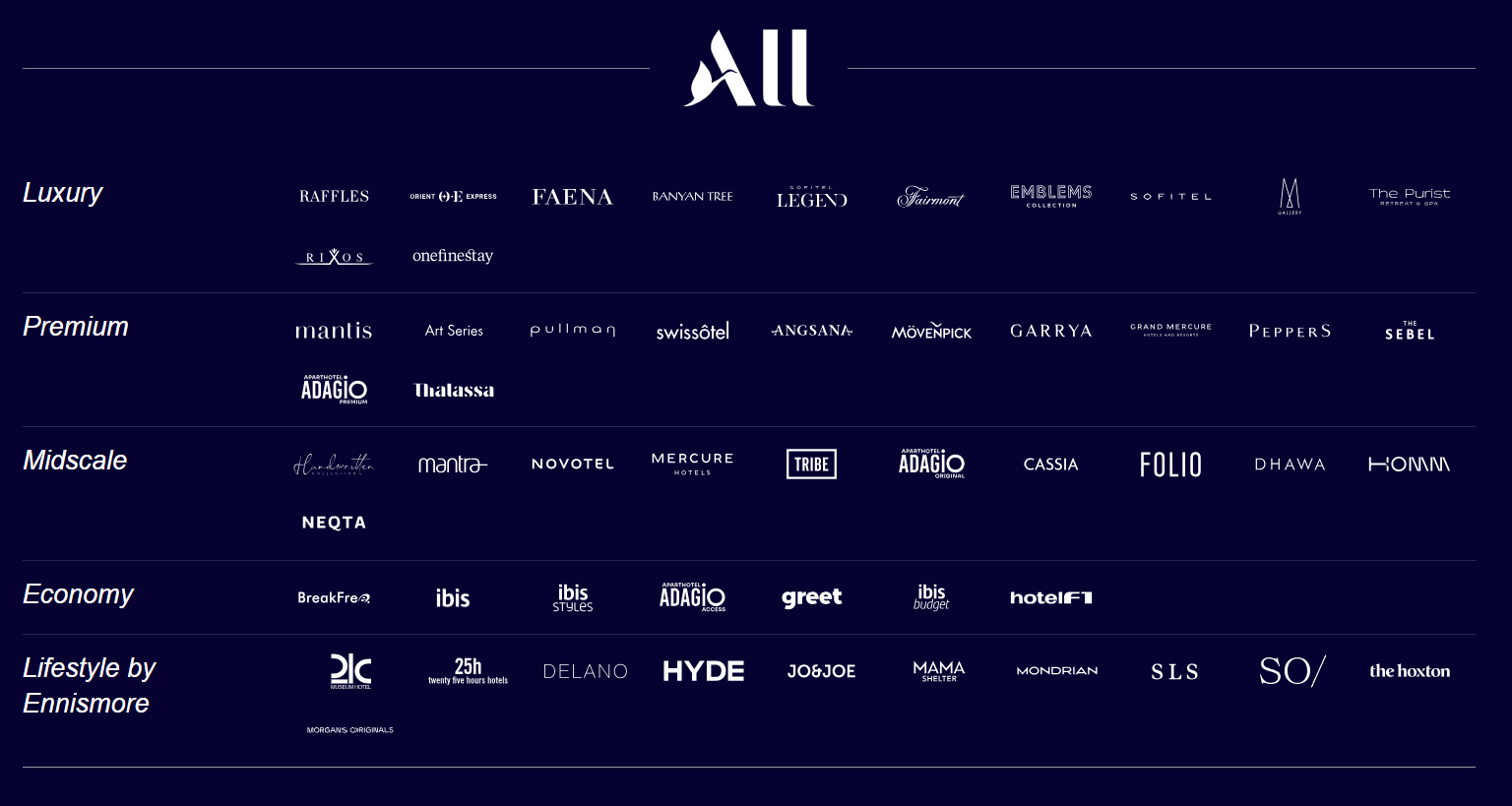 | All Accor brands not listed to the right | Ibis, Ibis Styles, Mama Shelter | Mantra, Peppers, Breakfree, Art Series, Adagio Original, and Extended Stay brands | Adagio Access, Jo&Joe, Greet |