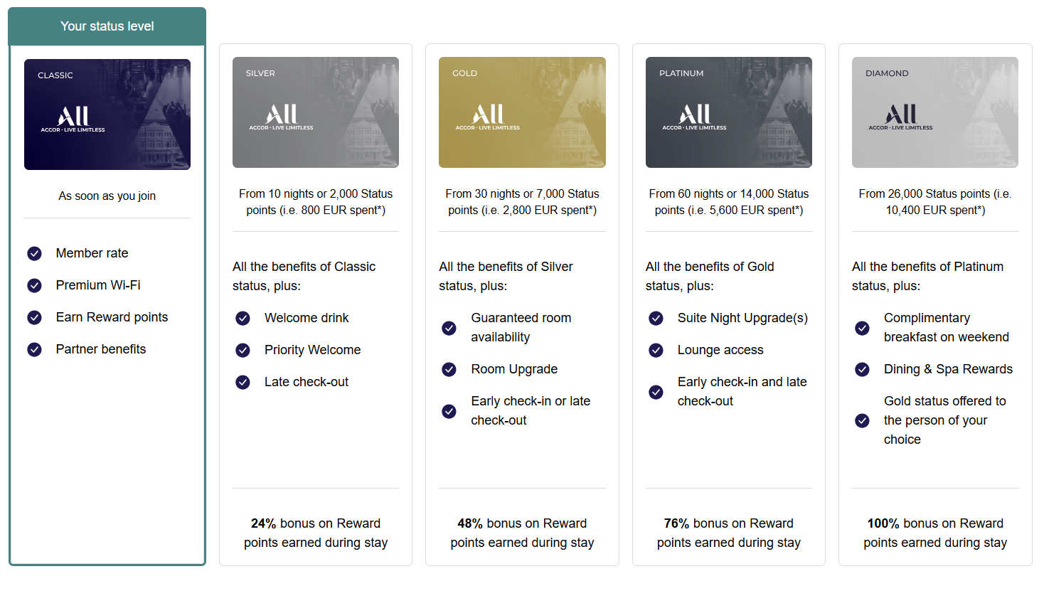 Accor has four levels of elite status: Silver, Gold, Platinum, and Diamond. Like many programs, the first three status levels can be earned by spending with Accor or by staying a certain number of nights within a membership year. Top-tier Diamond status, on the other hand, can only be earned through spending (26,400 status points, equivalent to ~€10,400 in annual spend).