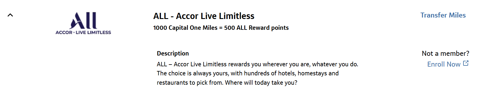 | Capital One Miles | 20% transfer bonus from Capital One Miles to Accor Live Limitless | 11/01/22 | 11/30/22 |