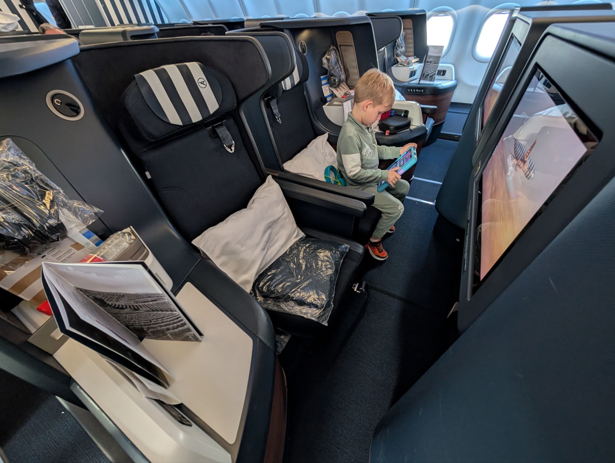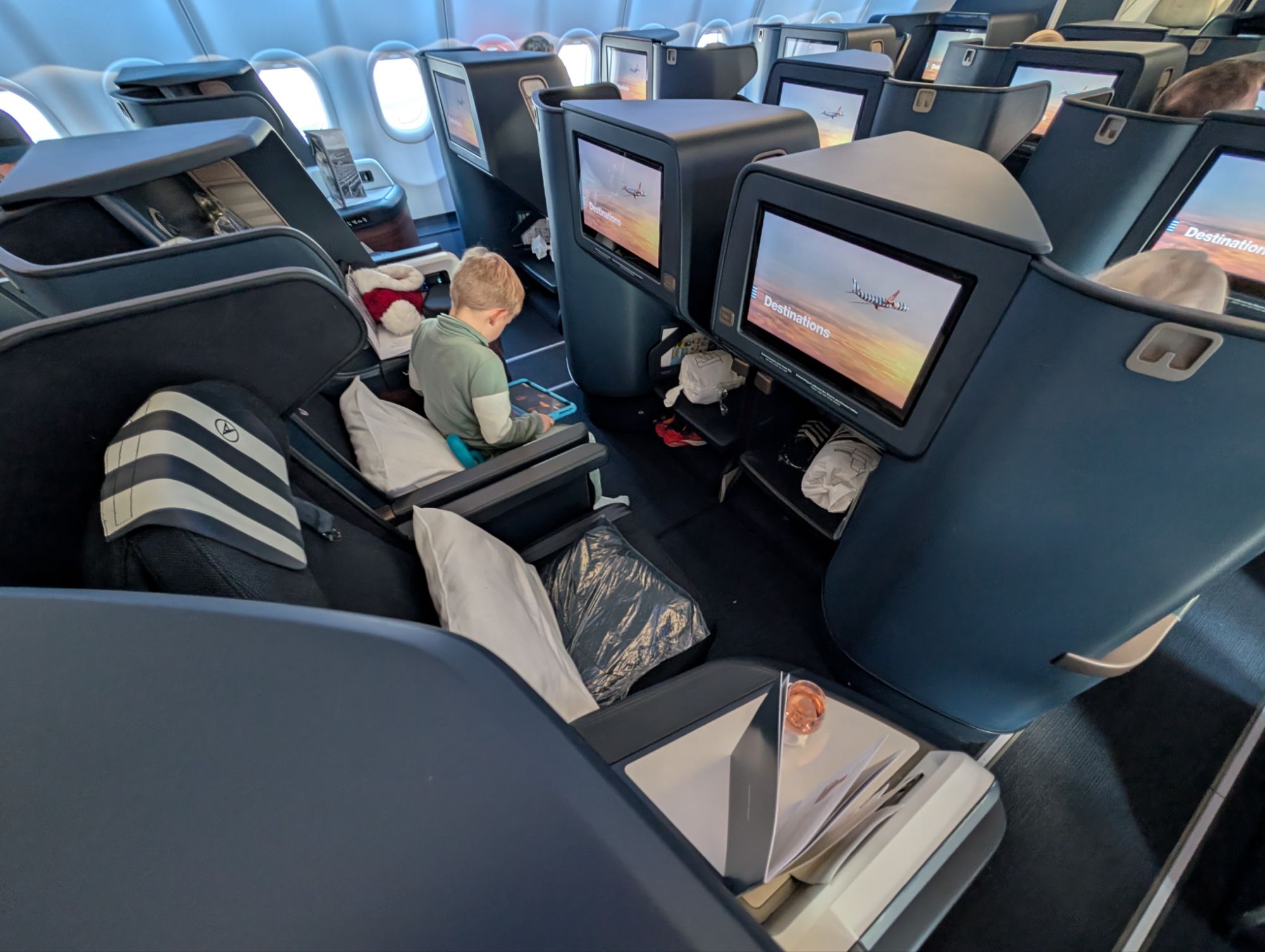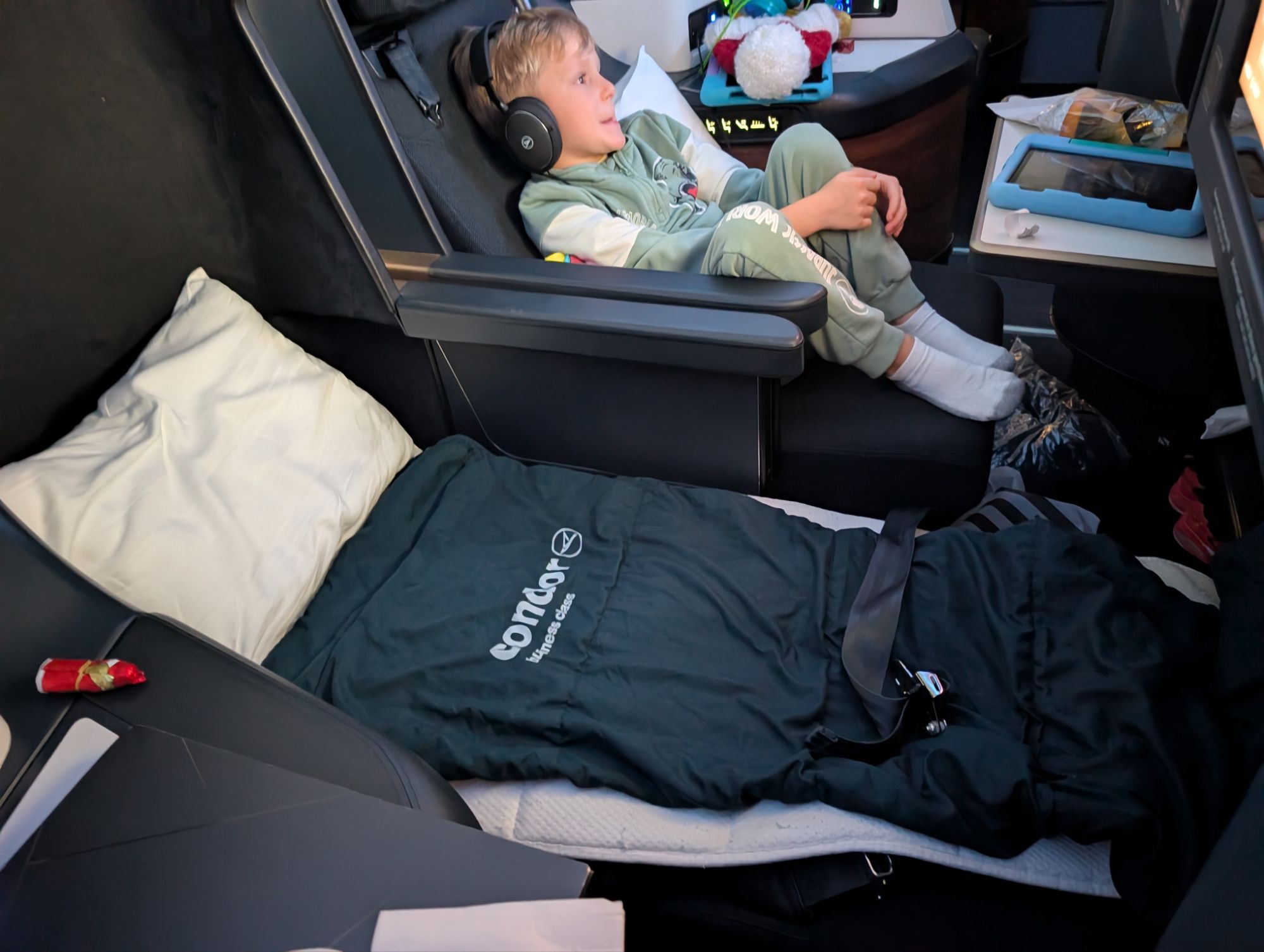 Condor’s fully flat seat is spacious, with one of the widest footwells I’ve seen in this style seat. The thick mattress topper is just what my recent SAS flight was missing, and it made the seat far more comfortable when reclined. Further, the seating layout is great for family travelers since middle rows alternate between seats being separated by their tables or being directly next to each other (which I always prefer when traveling with the kids so that I can easily reach over and help when necessary). The in-flight entertainment selection might have been the broadest I’ve seen of any airline but Emirates, and the in-flight service was on par with what you’d expect.