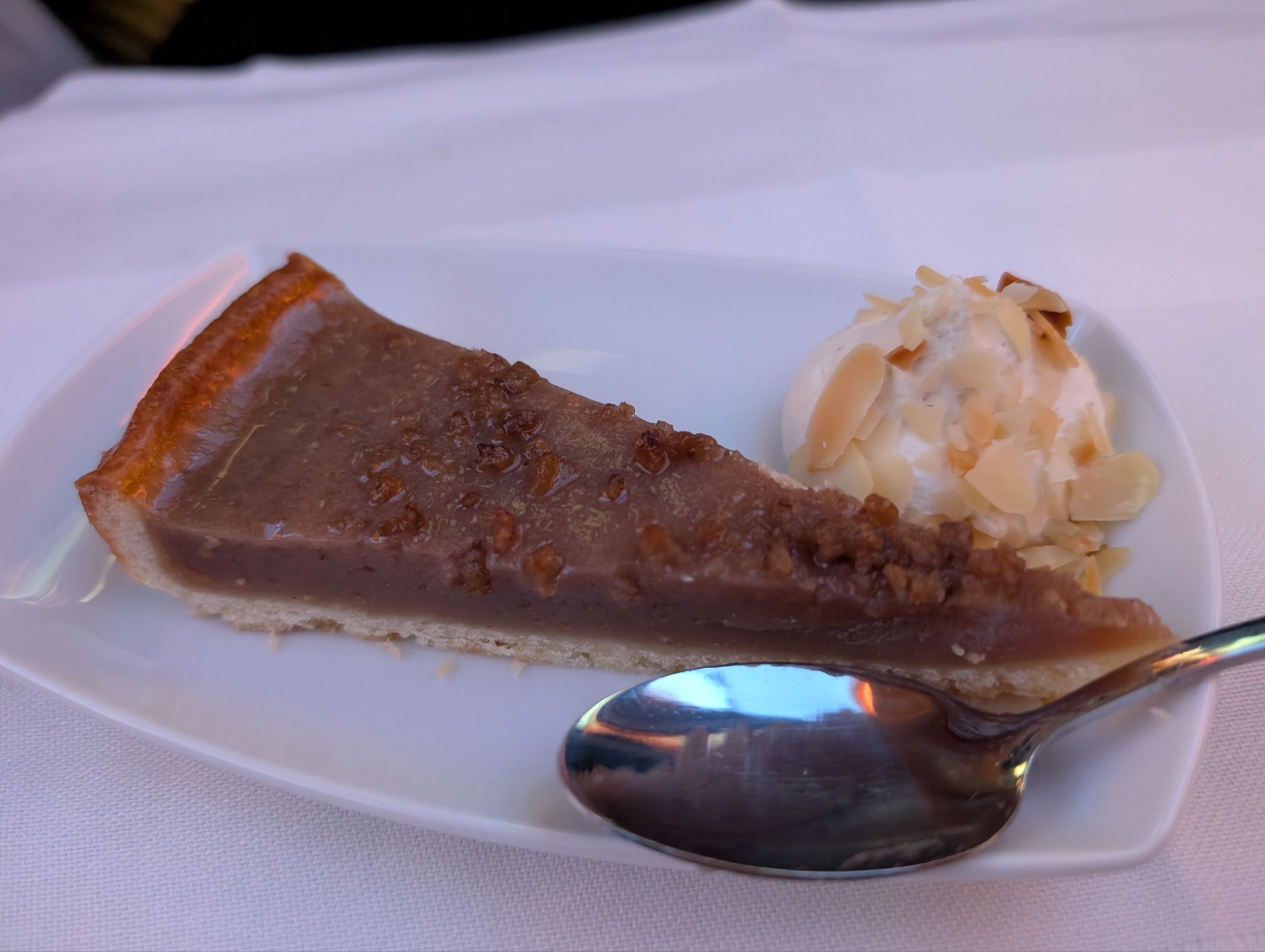 - Service: Fine. The purser was particularly animated and friendly. One slightly odd thing: when starters were served, we were each asked whether we wanted the cheese plate meant to accompany the starter (it wasn’t put on our tray until we confirmed that we wanted it). I’m all for reducing waste, but it felt more like a cost-savings measure to serve fewer plates of cheese (which probably wasn’t the goal, it just felt, well, cheesy).