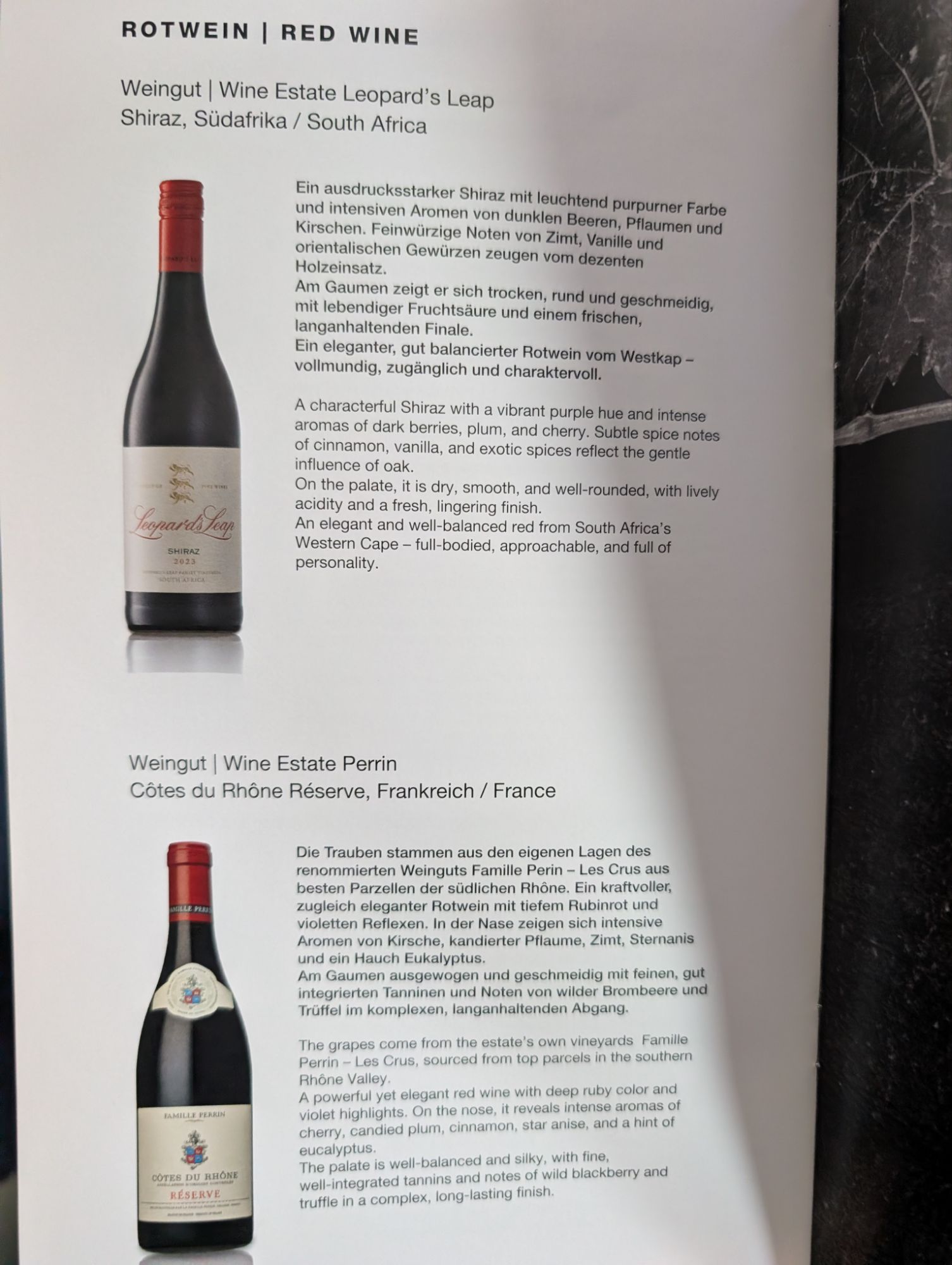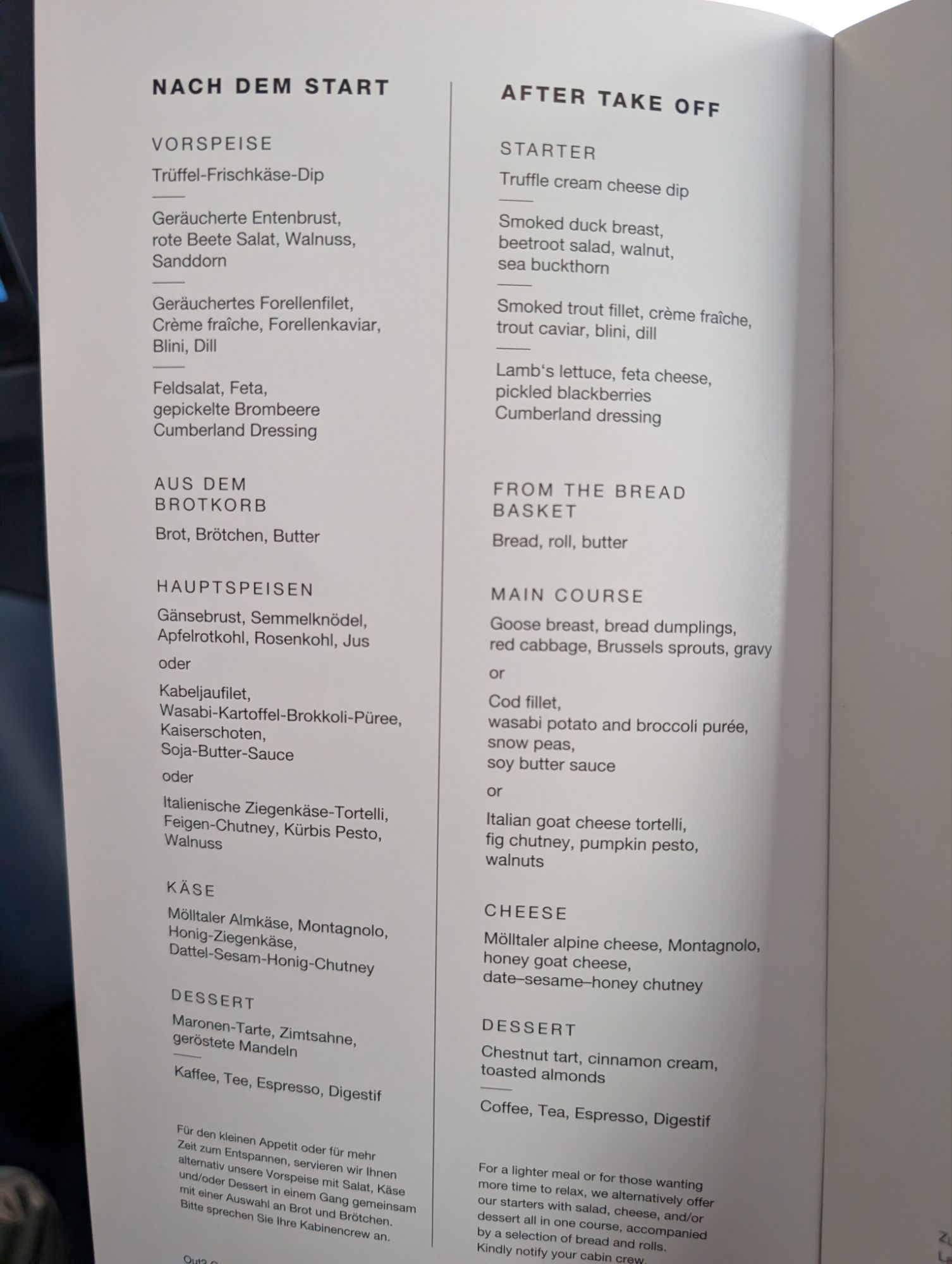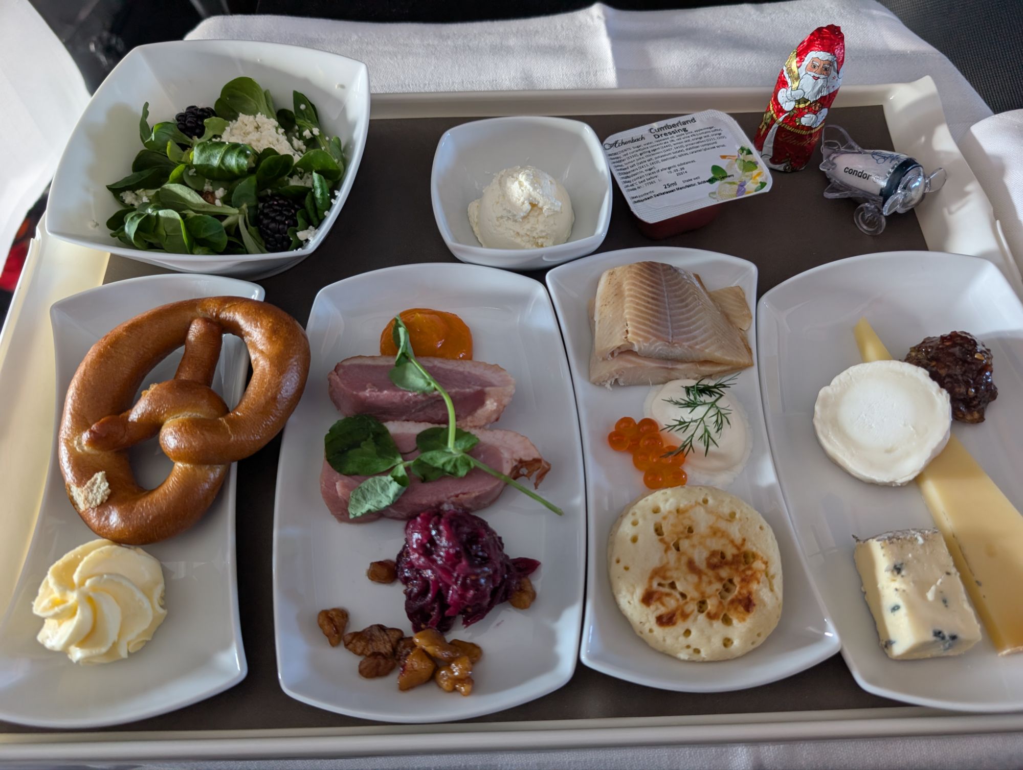 - Food and Beverage: Pleasantly surprising. The smoked duck breast with beetroot salad from the starter was the highlight for me, but the smoked trout with crème fraiche, trout caviar, and blini was also tasty (despite the fact that I don’t particularly care for fish). Main course options included goose breast, cod fillet, or Italian goat cheese tortelli. Snack options before landing included a German-style cheesy noodles, which I enjoyed as much as some I had in the Christmas markets.