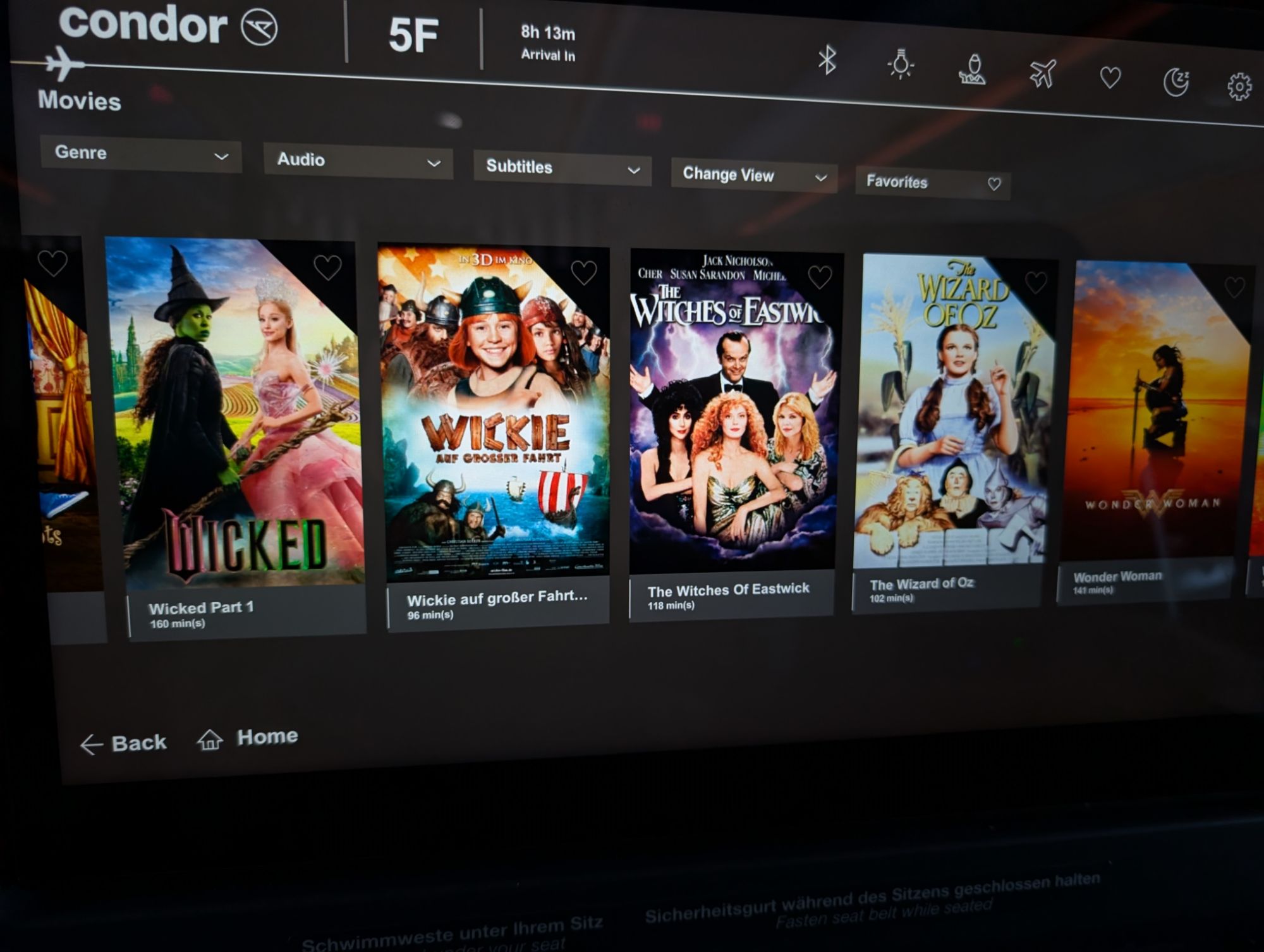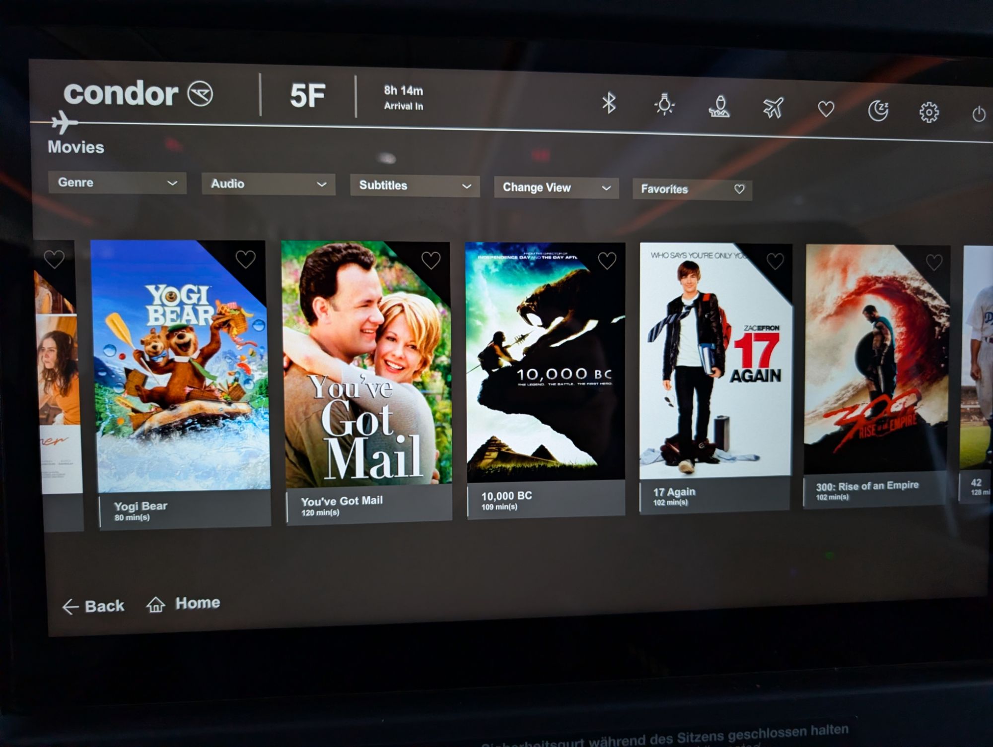 - In-flight Entertainment (IFE): Excellent. Condor had an impressively wide array of movie options, from classics (Casablanca, Gone with the Wind) to more obscure cult hits (Best in Show, Magnolia) to full movie series (all the Harry Potter films, all the Ocean’s 11 films) to behind-the-scenes documentary-style shorts about airline operations.