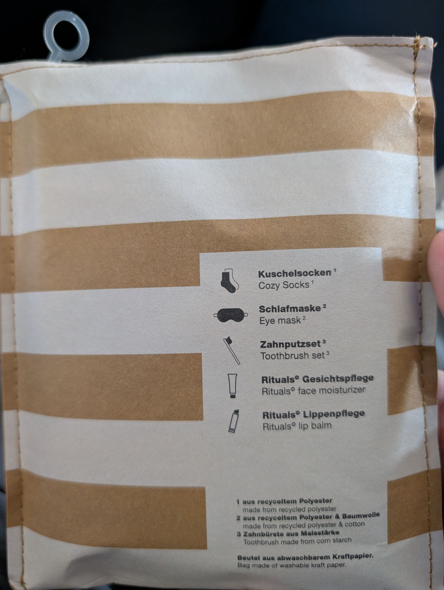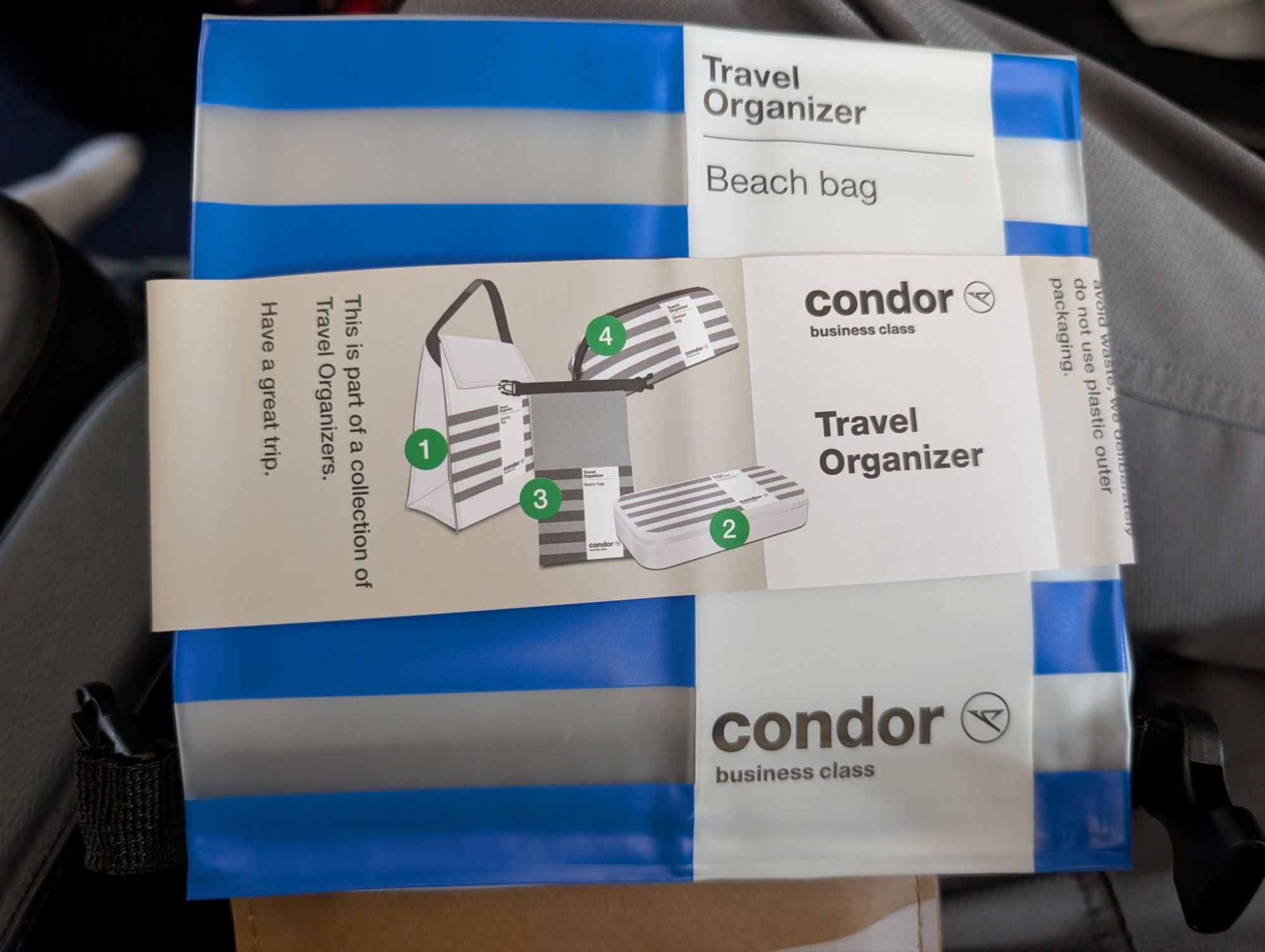 - Amenity Kit: The kit itself is presented in a bag that says it is produced of recycled polyester, though it felt more like a thick paper bag. It contained the usual stuff. Alongside the amenity kit, Condor provides a travel bag. It looks like there are 3 different styles of that bag distributed; on our flight, it was a “beach bag” (the thick plastic type you put stuff in and roll down and clip to keep water out of the bag). I think it’ll be useful.