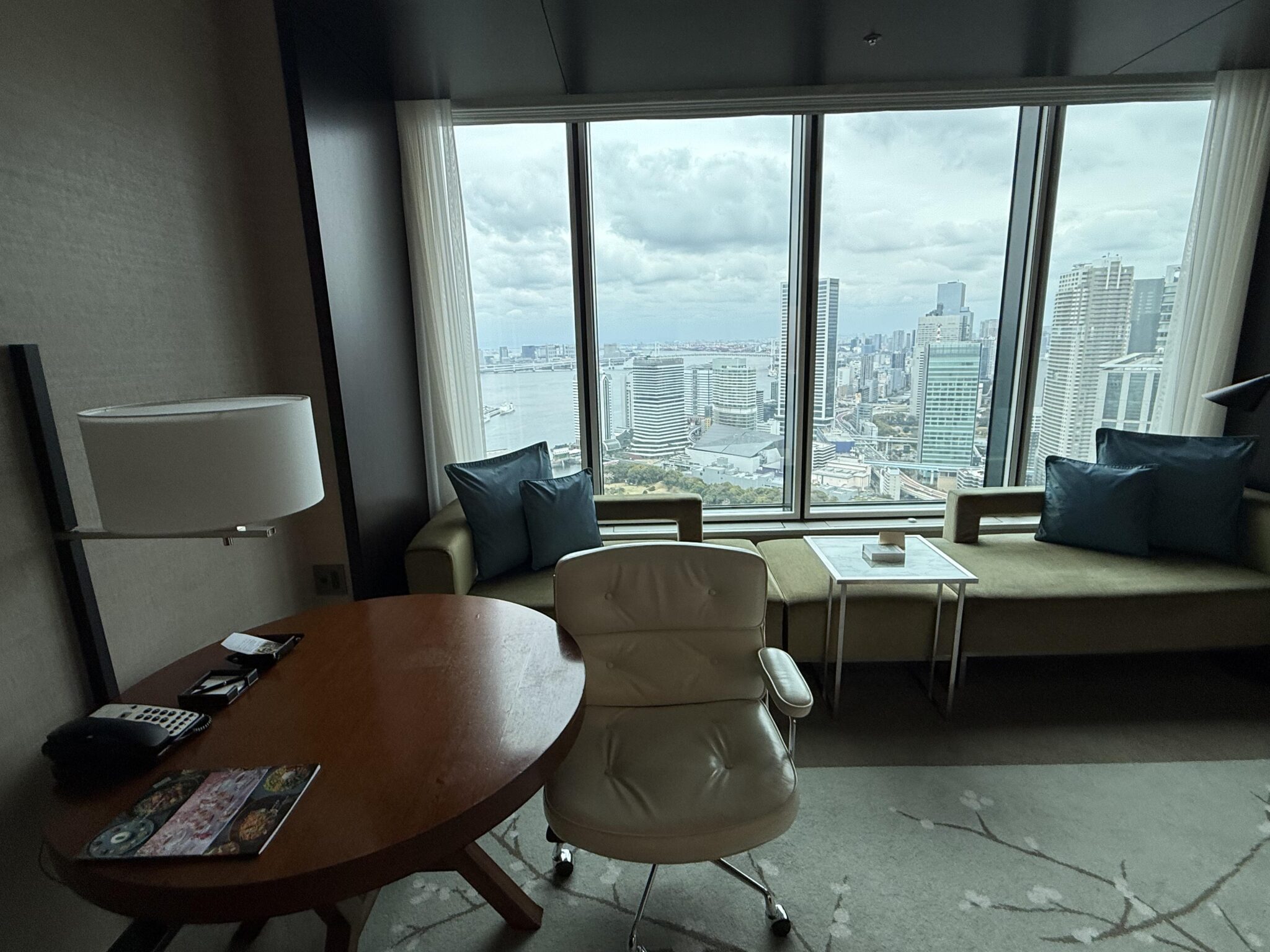 - Room: We booked a standard City View King Room and were upgraded proactively to a ~500 sq ft Executive Bay View Room. As far as I can tell, the only difference between the two was that the Bay View had a marvelous view of Tokyo Bay and Hamarikyu Gardens, as well as access to the Executive Lounge (which we would have had anyway because of our Diamond Statuses). That said, it was a spiffy, extremely comfortable room that we enjoyed immensely. I’ve been to many hotels in Tokyo with comfy banquette/chaise lounges in front of the windows, and this was no exception, providing a stellar place to work and have coffee or evening cocktails. Everything in the room was plush and in great shape, and we loved seeing the views from our soaking tub.