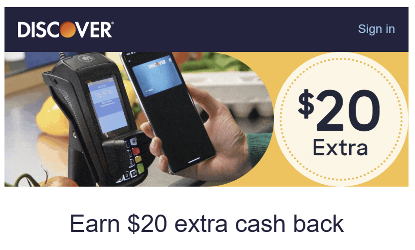 - Earn $20 Cashback Bonus® when you spend at least $100 on new purchases made using your Discover® Card with your Digital Wallet. Digital Wallet purchases can be made in-store or online for Apple Pay®, Samsung Pay™, Garmin Pay™, and in-store only with Google Pay™.