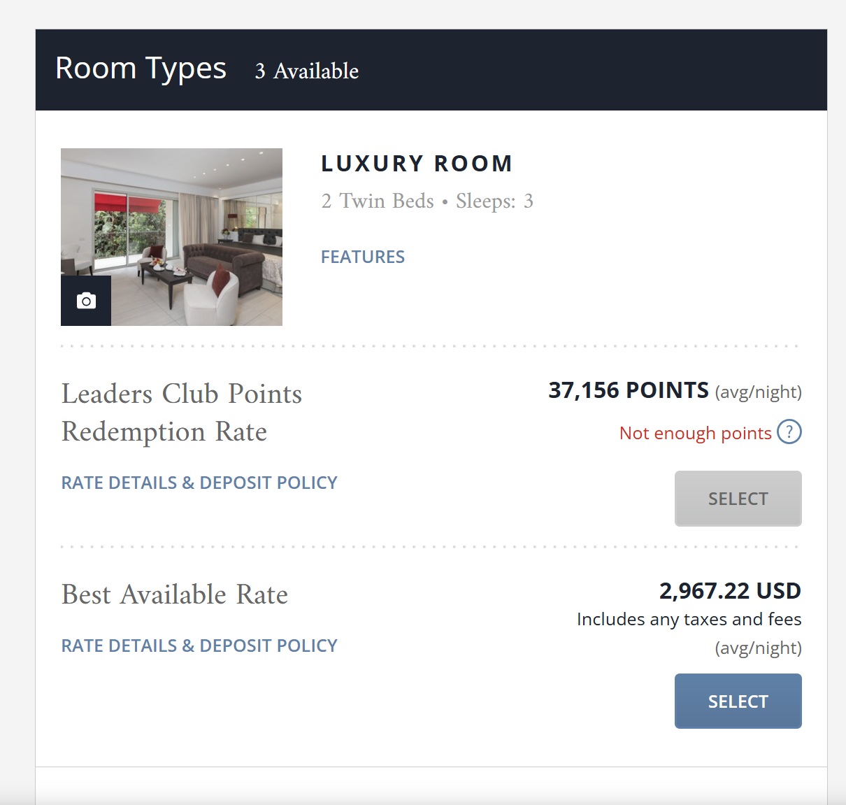 The downside is that it isn’t cheap, whether paying with cash or points. For sample dates I searched this summer, room rates (for a room that only accommodates 3 people) started around $3K per night, with award rates starting at more than 37,000 LHW points per night.