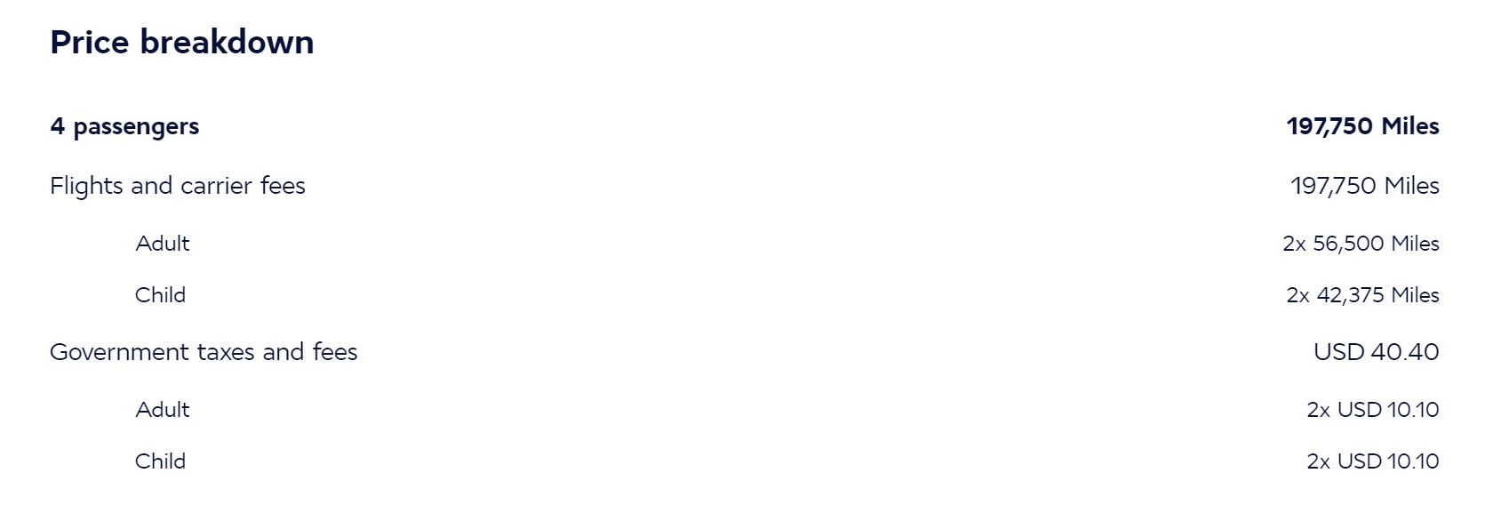 This means that if you book a business class award ticket between the US and Europe for 60,000 Flying Blue miles one-way, a child on the same itinerary would pay 45,000 miles. Note that taxes & fees will be almost the same (the discount does not apply to the cash component), but the mileage savings can add up for a family with multiple kids. This discount applies across cabins and even to the monthly Flying Blue Promo Rewards. The example below shows the cost breakdown for an award trip where I booked 2 adults at 56,500 miles each in business class and 2 children at 42.375 miles each on Air Europa.