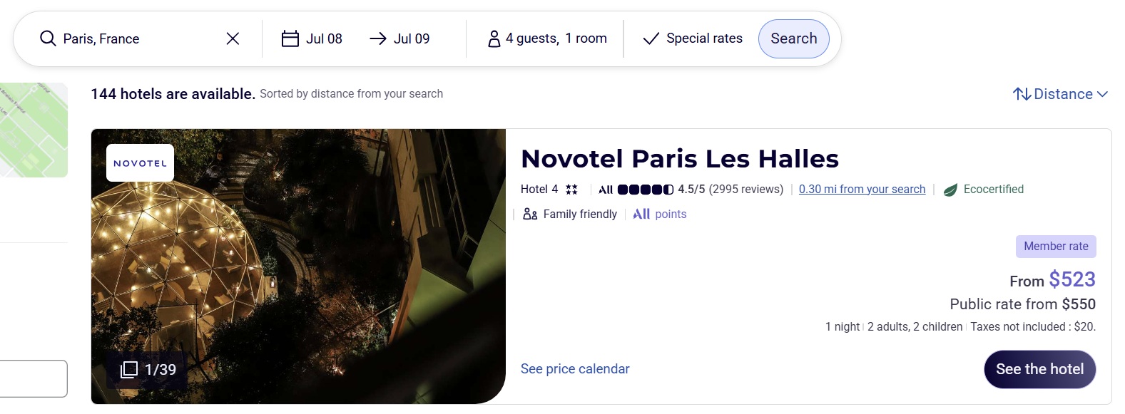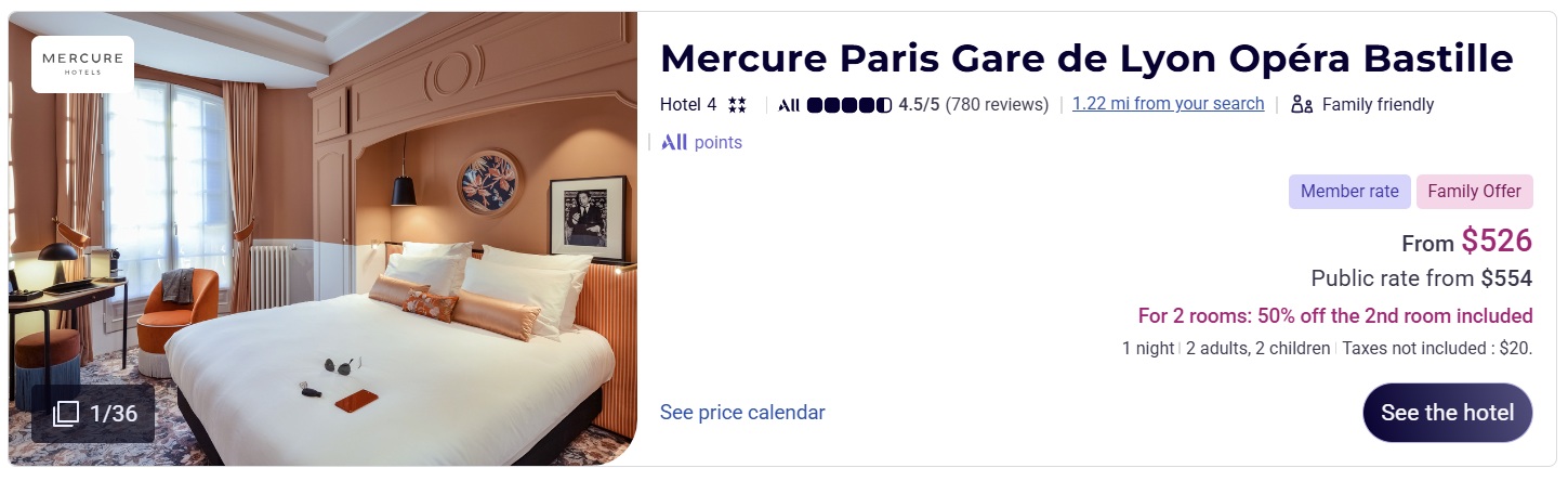 I recently stumbled on this offer by simply searching for a party size big enough to need two rooms (3 adults and 2 children in my case). Not all hotels seem to make this rate available, but when they do it can be a solid deal. Keep in mind that ALL Accor points are redeemed at a fixed value against cash rates and can be used to pay for your room at checkout, so it should be possible to cover the family rate using points. See more detail about the family rate here at the ALL Accor website and more detail about the ALL Accor program in our complete guide.