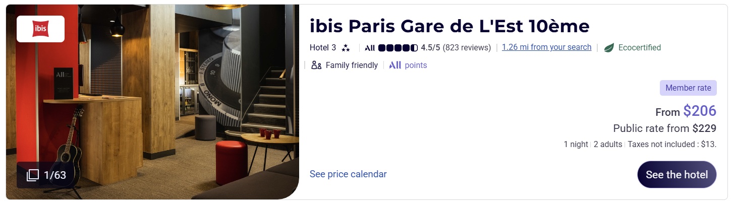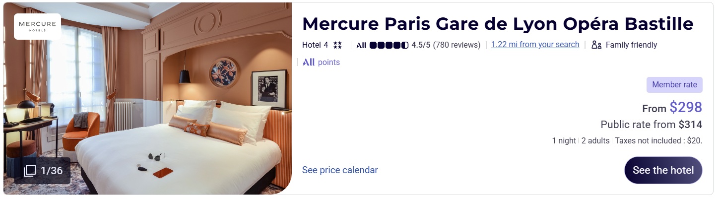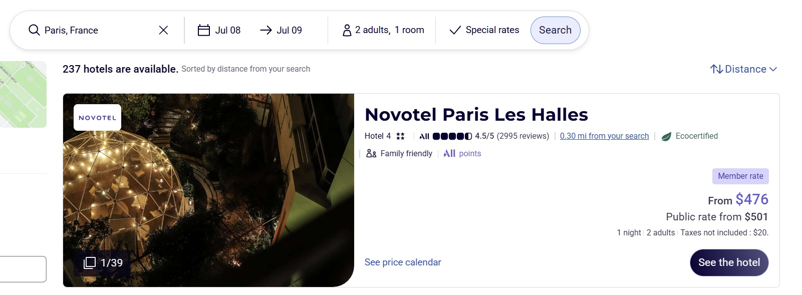 As an example, see the following Paris properties searched for a single room for 2 adults on a random summertime date:
