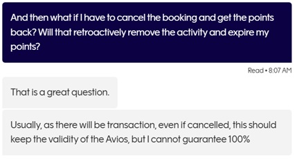 What if you then cancel the award and get your points back? Does the activity on your account still count? I don’t know (and the chat agent didn’t know either). The safe thing to do is to move points back to British Airways as soon as you can.