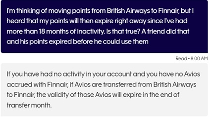 Points don’t expire instantly when moved into an 18-month inactive account. Instead, the points expire at the end of the month in which they were transferred. I got this tip from a friend, and I verified it via an online chat with Finnair (note that the AI chat agent incorrectly told me that transferring from British Airways would count as activity — I had to chat with a real person to get the right answer):