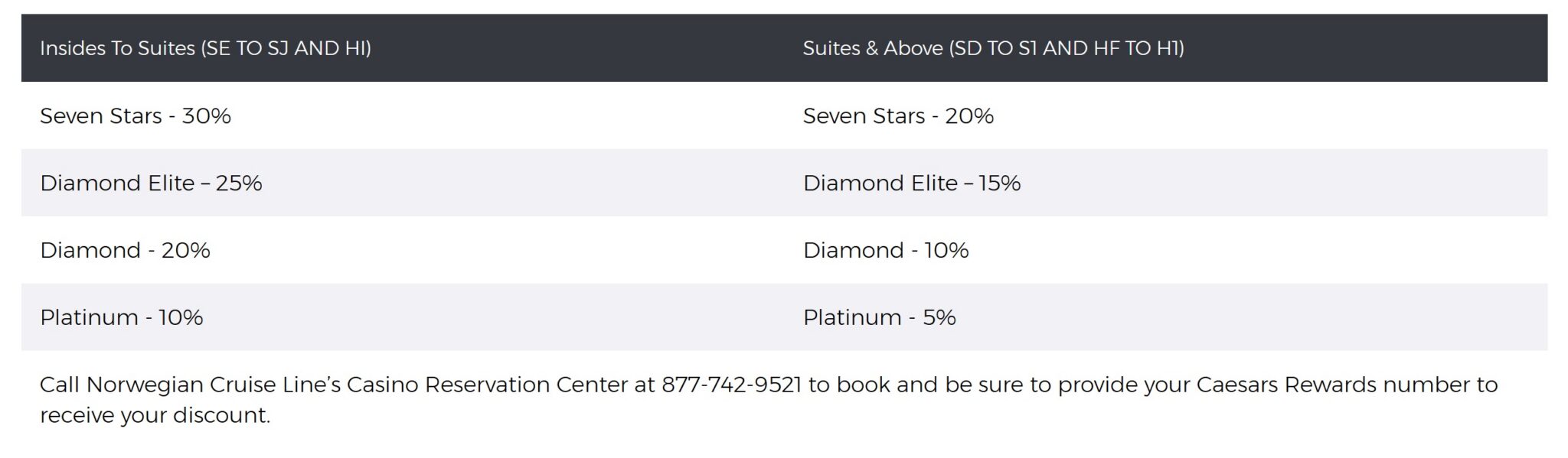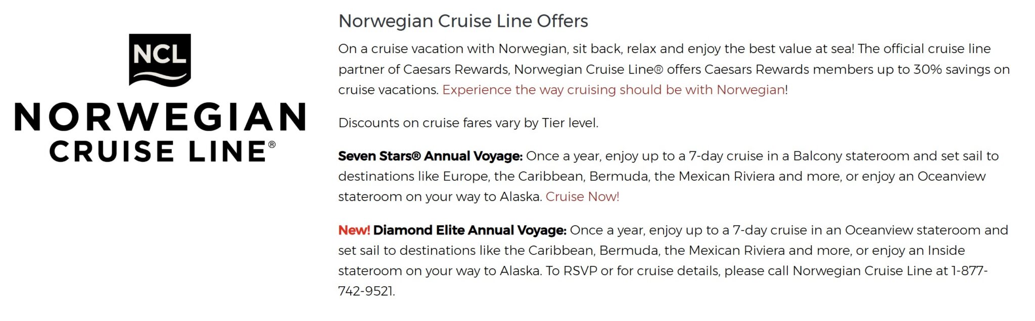 Caesars elites can enjoy savings on Norwegian cruise lines that range from 5% to 30% depending on elite status level of cabin type being booked.