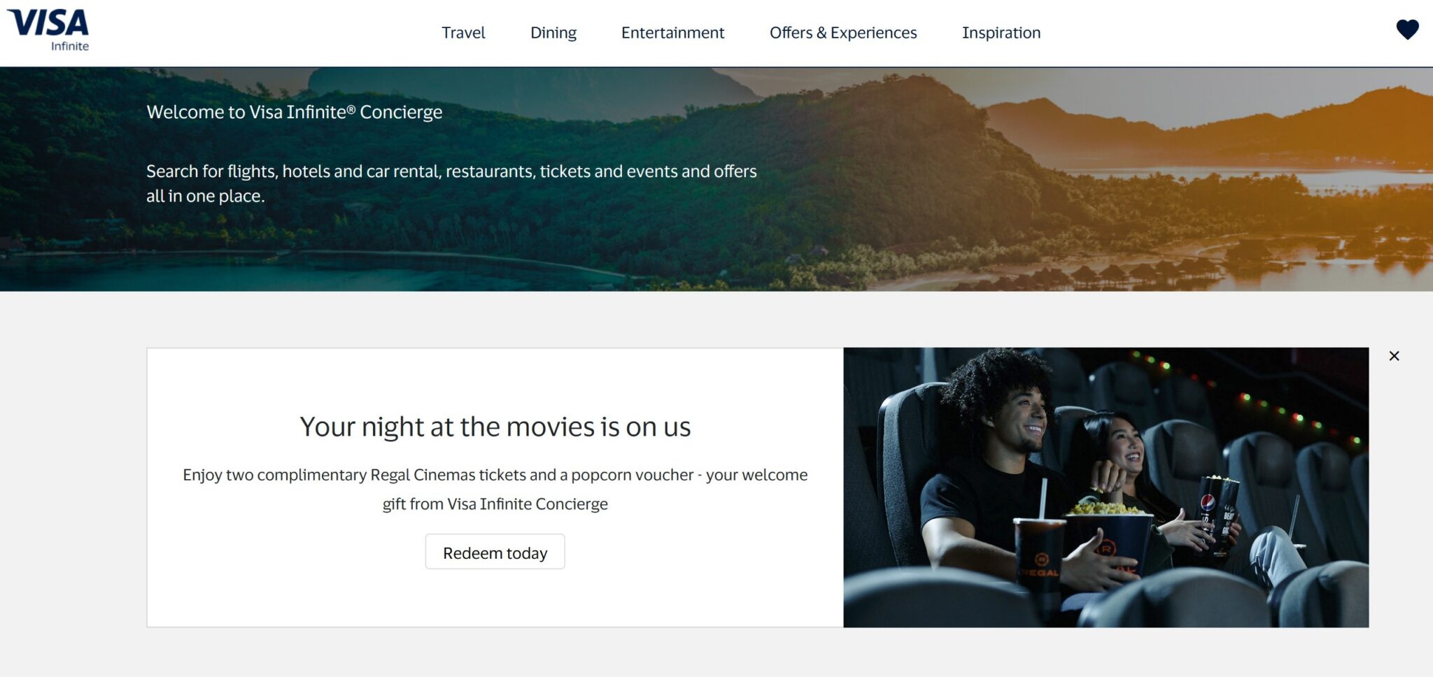 - Visa Infinite Concierge is offering 2 free Regal Movie tickets + popcorn when youn register for an account (using a Visa Ininfite card) and claim the offer