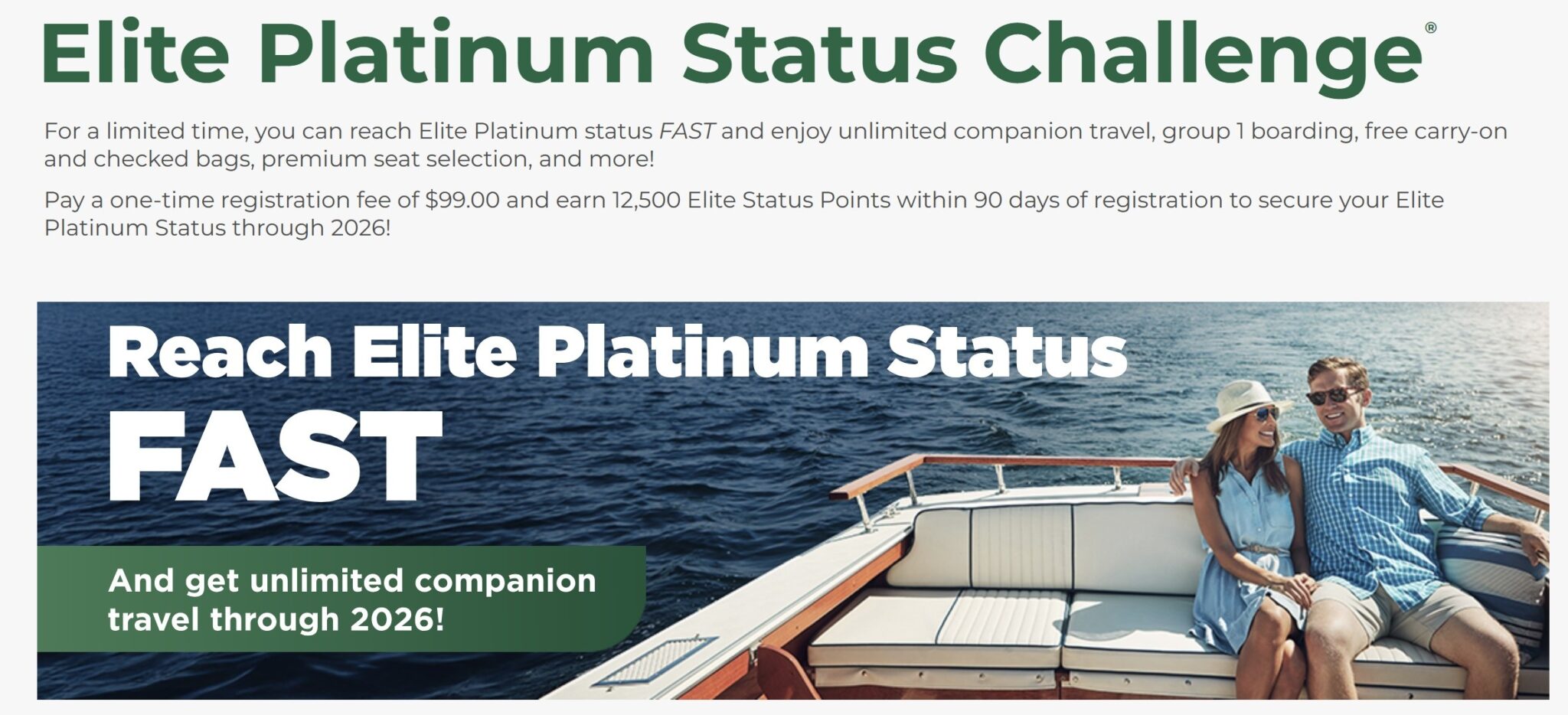 To participate in this challenge, you must register and pay a one-time $99.00 fee at https://www.flyfrontier.com/PlatinumChallenge. Following registration, you have 90 days to earn 12,500 Elite Status Points. The last day to register for this challenge is December 31, 2025. Elite Platinum Status will be awarded within 3-4 business days of reaching the earning requirement and will be valid until December 31, 2026.