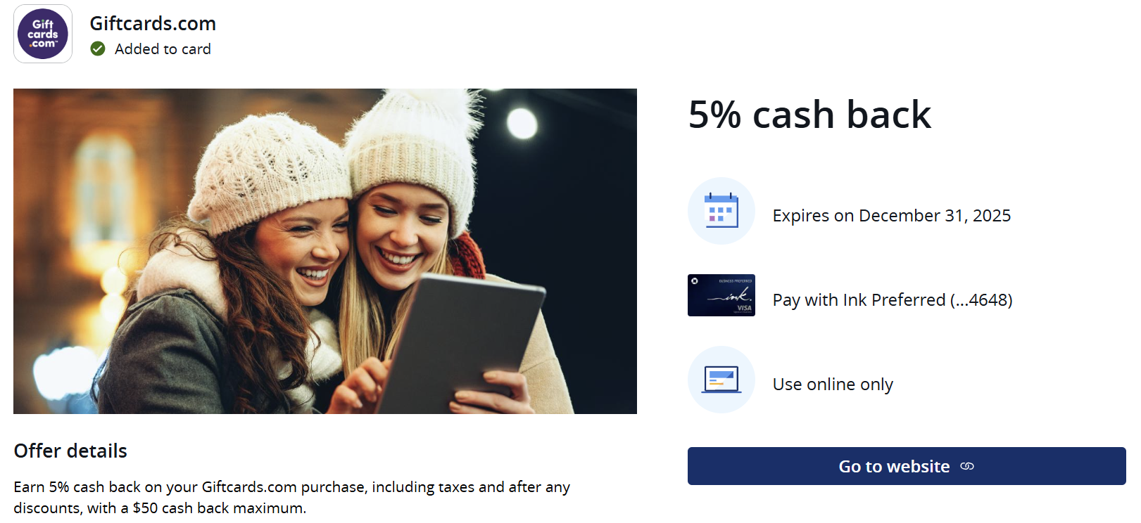 - Get 5% back on Giftcards.com purchases with a Chase Offer.