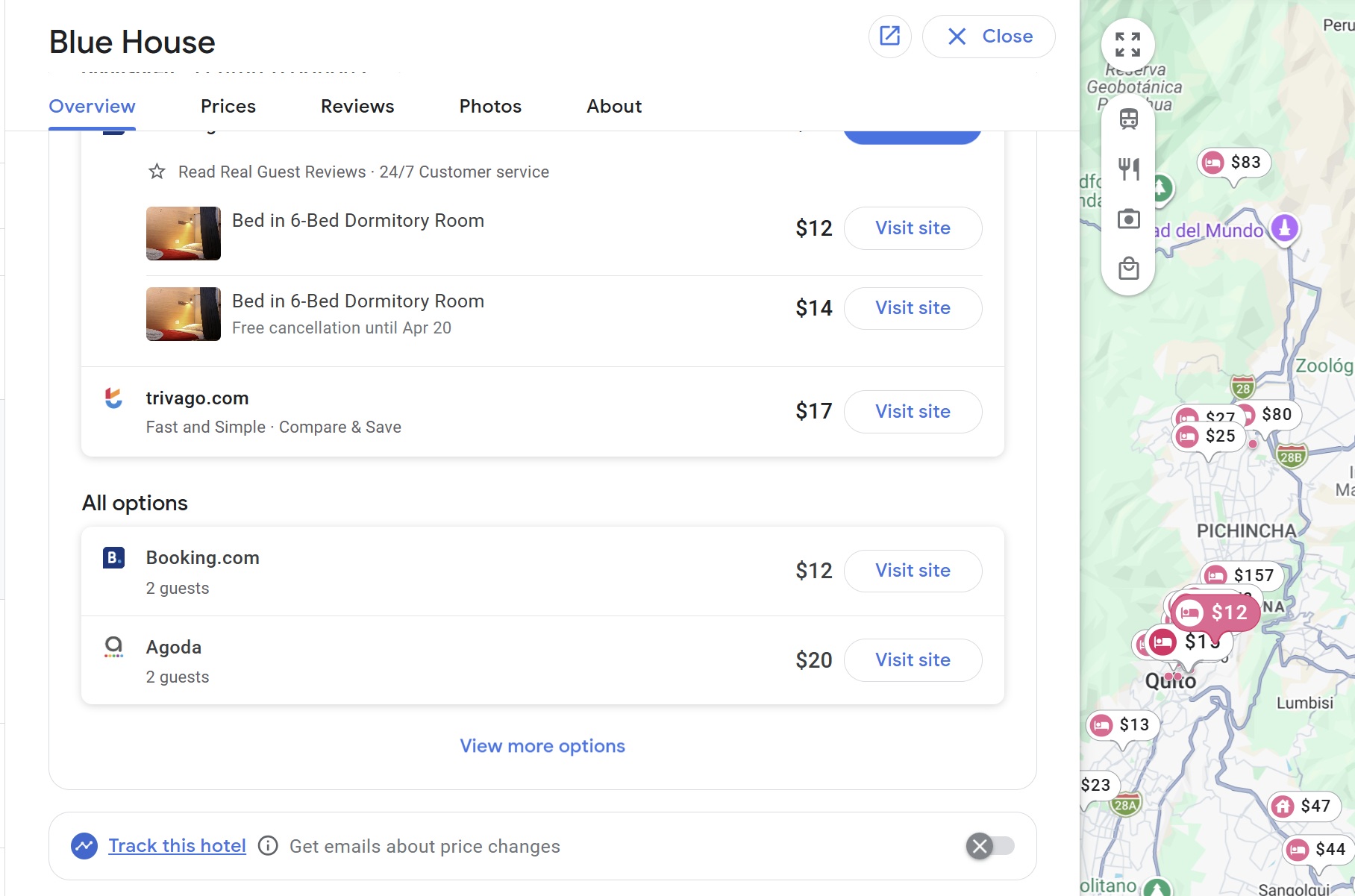I am not positive whether this feature has been enabled for all hotels listed on Google Hotels, but I see the button to track prices at the bottom of each property I’ve checked thus far. I wondered whether some types of accommodation might be excluded, but I found the ability to track even on a dorm bed in a $12/night hostel in Quito, Ecuador.