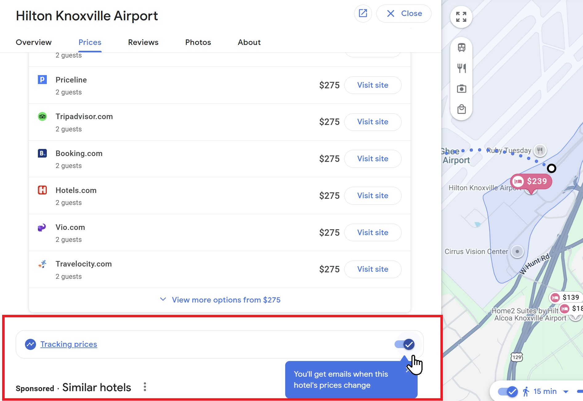 In order to track a hotel, you’ll need to search for hotels in/near a city or place of interest, then click on an individual hotel to see the full price breakdown across multiple sites. The button to track is at the bottom of the list of booking sites, as shown above. You’ll need to make sure to scroll down to find it.