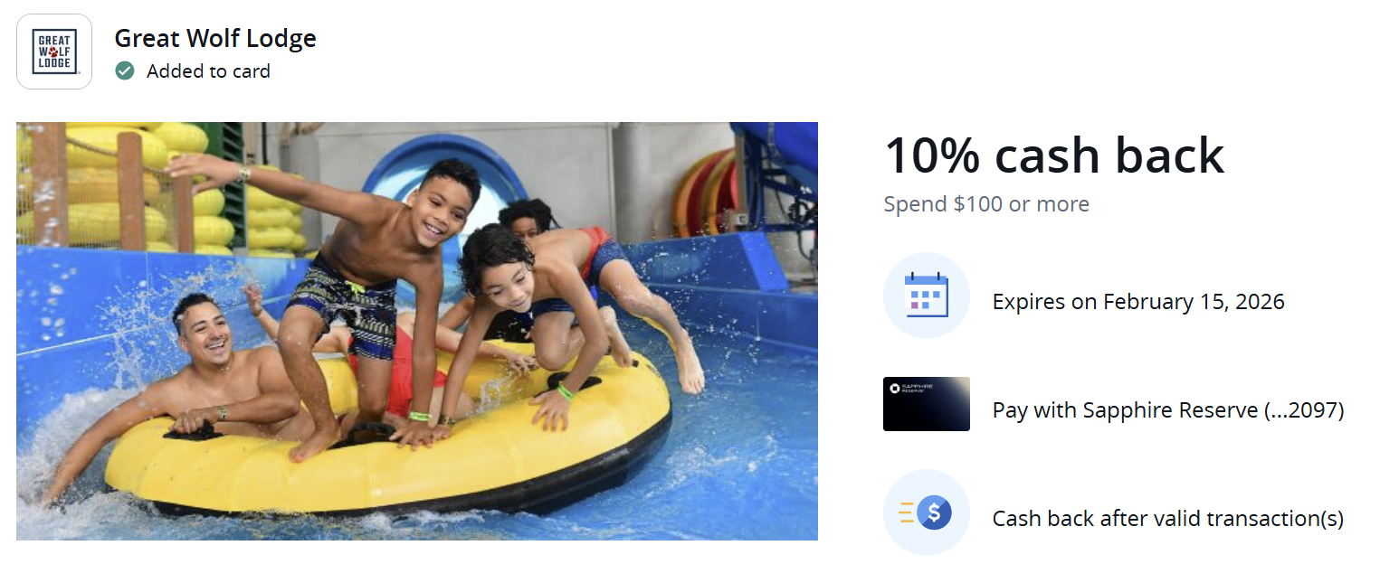- Get 10% back at Great Wolf Lodge with a targeted Chase Offer.